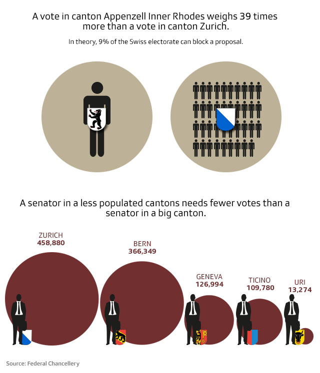 In Switzerland, most of the small cantons are rural, while the urban ones naturally have more people and are constantly growing. In other words, federalism favours people living in the countryside.
