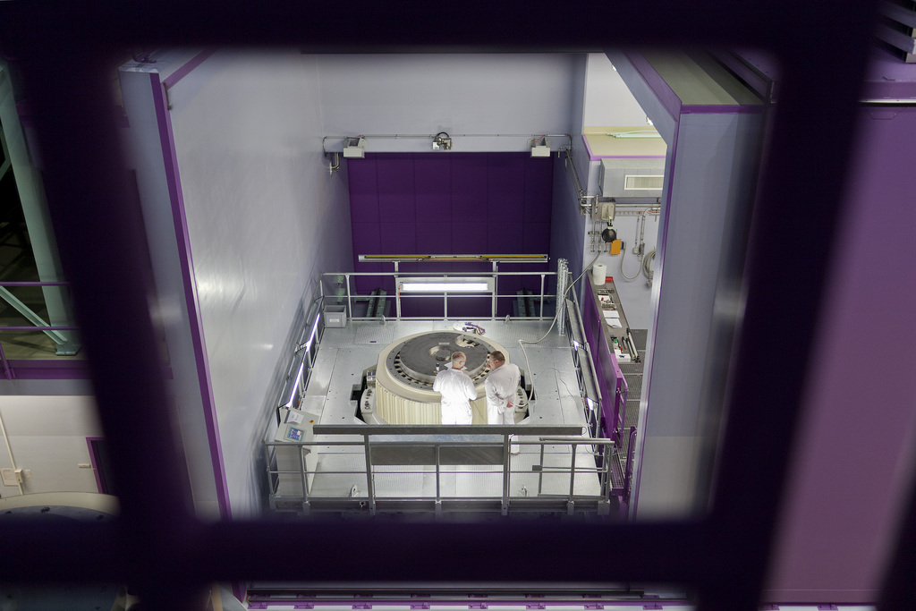 The telescope probe tip of a dosimeter, which measures ionising radiation (left), and the "hot cell" where fuel elements are transferred and storage containers are controlled and repaired.