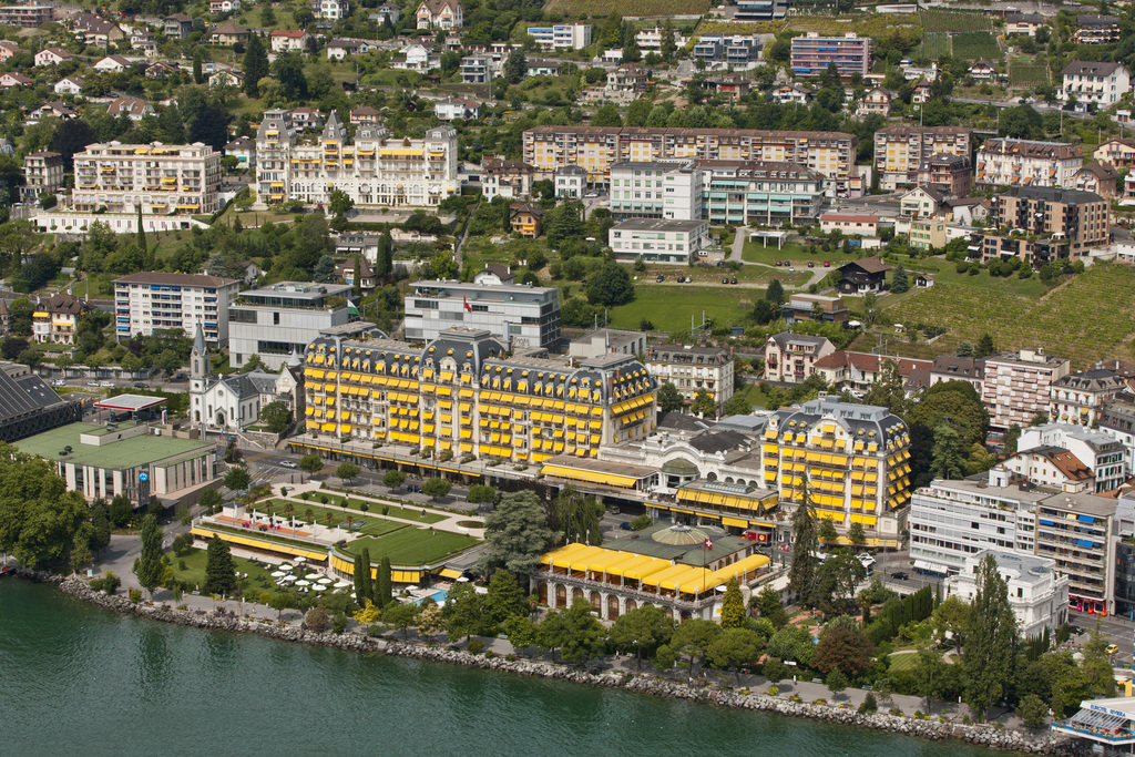 Heavy rain drums against the bright-yellow canvas awnings covering the windows on the front of the five-star Montreux Palace Hotel. Outside, the main high street is quiet.