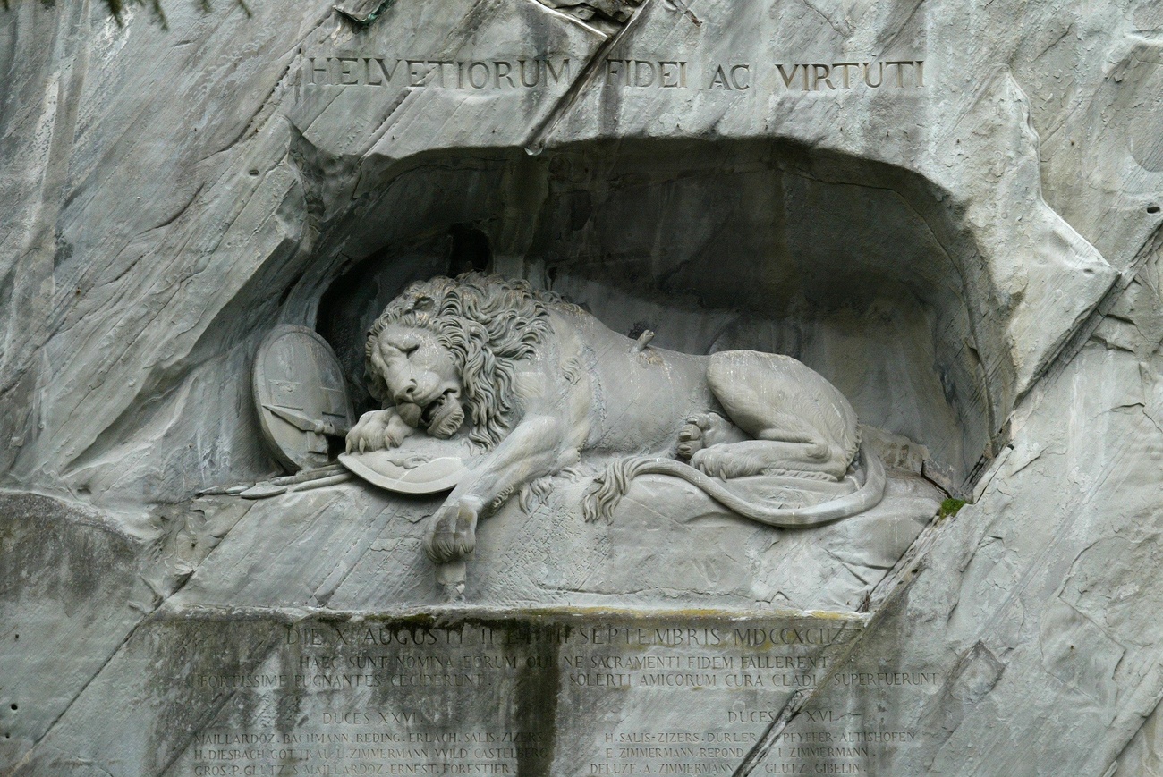 The Lion of Lucerne is situated just outside the old city, up on a hill. The massive sandstone monument of a lion impaled with a spear is about 10 metres long and 6 metres wide and stands behind a pool of water. The proud animal is in its death throes, a front paw resting on a shield adorned with the fleur-de-lys of the French monarchy next to another shield bearing the Swiss cross.