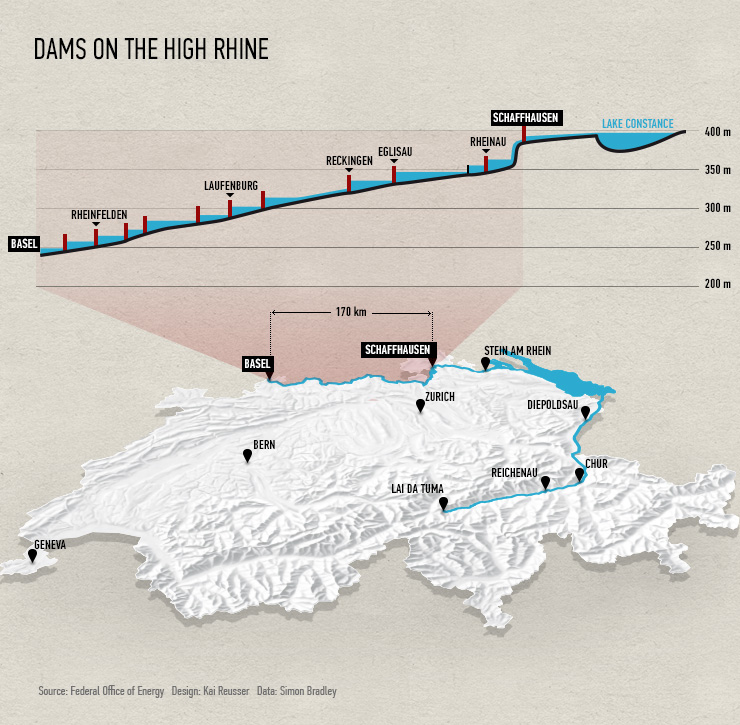 From the Rhine’s alpine source to the riverbanks of industrial Basel, swissinfo.ch explores the Swiss stretch of the vital European waterway. The many dams on this section continue to destroy fish spawning grounds and habitats - but there are signs of recovery.