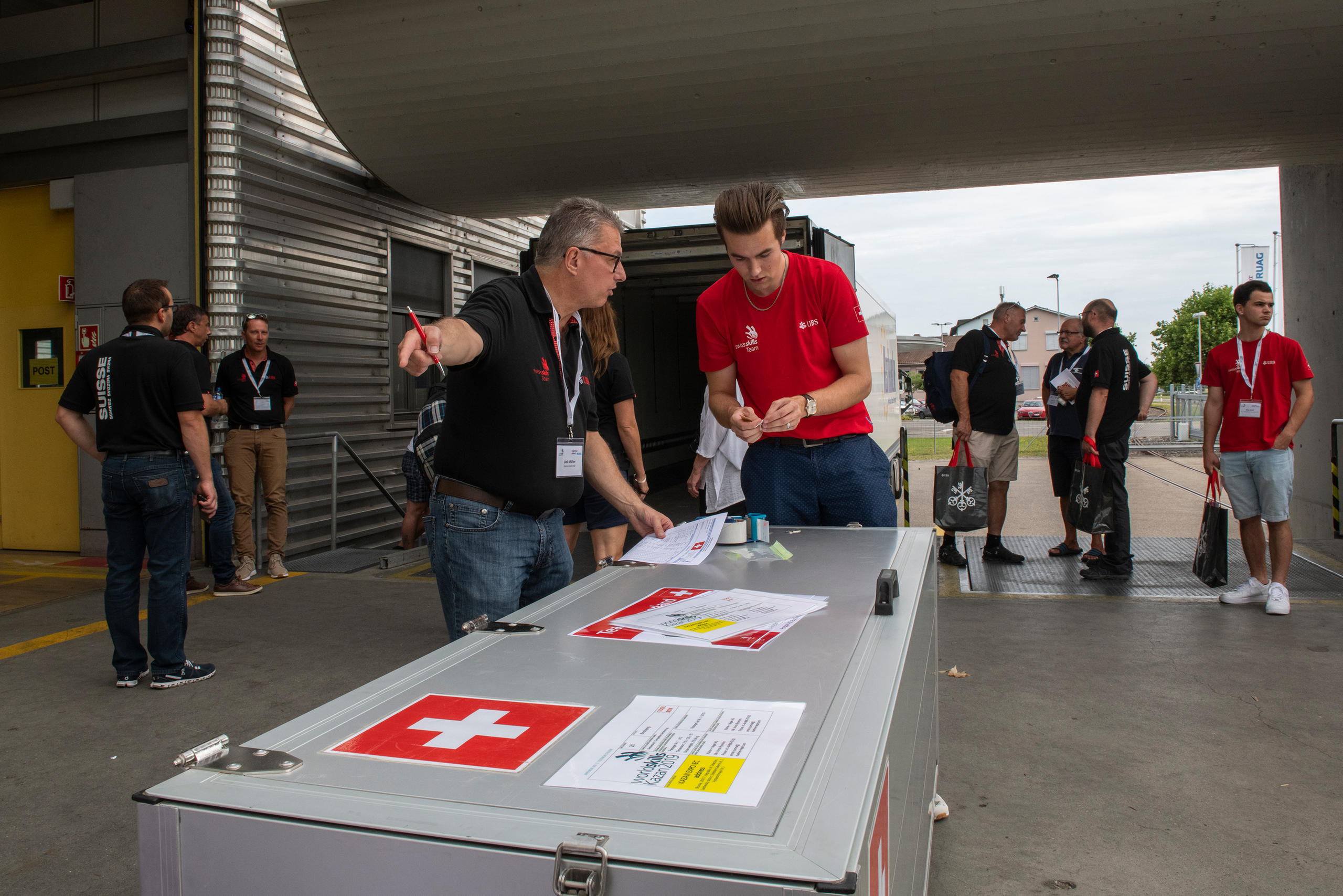First up, explains Ueli Müller, secretary general of the SwissSkills foundationExternal link, which organises the Swiss participation – and also sports a black t-shirt – is the loading up of the material and equipment.