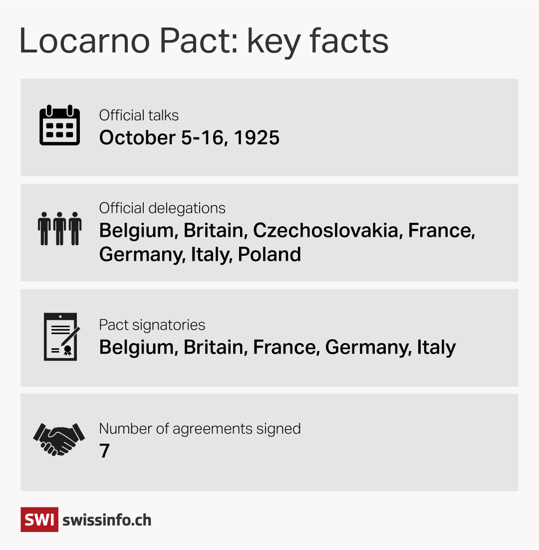 Yet many historians argue that a true settlementExternal link was only reached six years later in Switzerland. There, diplomats spent ten days hammering out treaties of the lesser-known Locarno Pact. The main signatories, Germany, France, Britain, Italy and Belgium, renouncedExternal link force in all cases but self-defence.