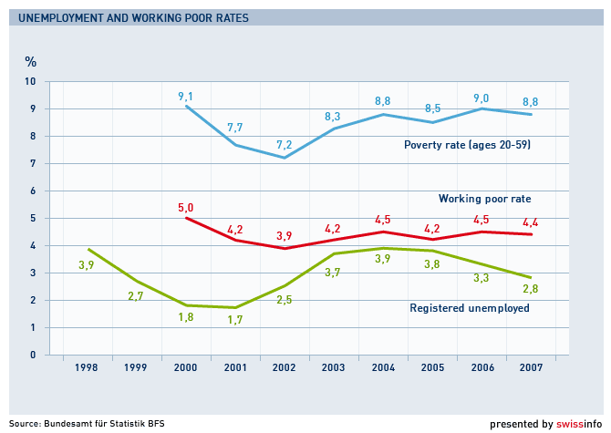 The number of people classified as working poor in Switzerland decreased from five per cent to 4.4 per cent from 2000 to 2007.