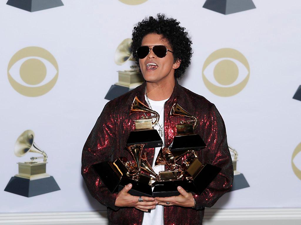 L’homme de spectacle de 32 ans, au style flamboyant, est reparti avec six récompenses, record de la soirée, couronné dans les catégories reines d’album de l’année pour «24K Magic», enregistrement de l’année pour le morceau-titre de l’album et chanson de l’année pour «That’s What I Like».