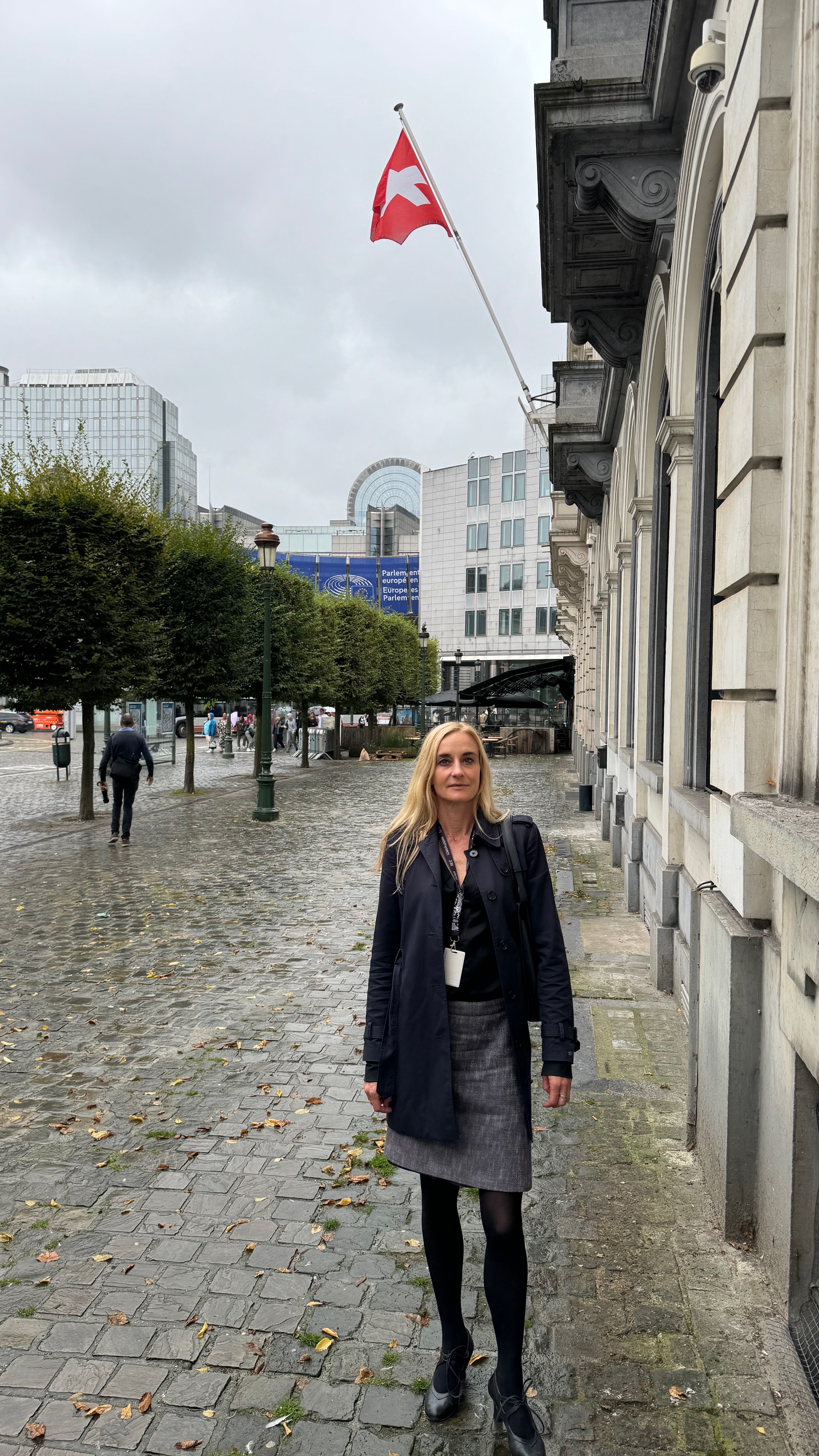 «Nous fonctionnons ici à Bruxelles comme une petite administration fédérale. Mon rôle est d’identifier, avec mes collègues des offices spécialisés, les projets de loi importants pour la Suisse et de les accompagner étroitement», explique la conseillère d’ambassade Sandra Imhof, sous le drapeau suisse devant le Parlement européen.