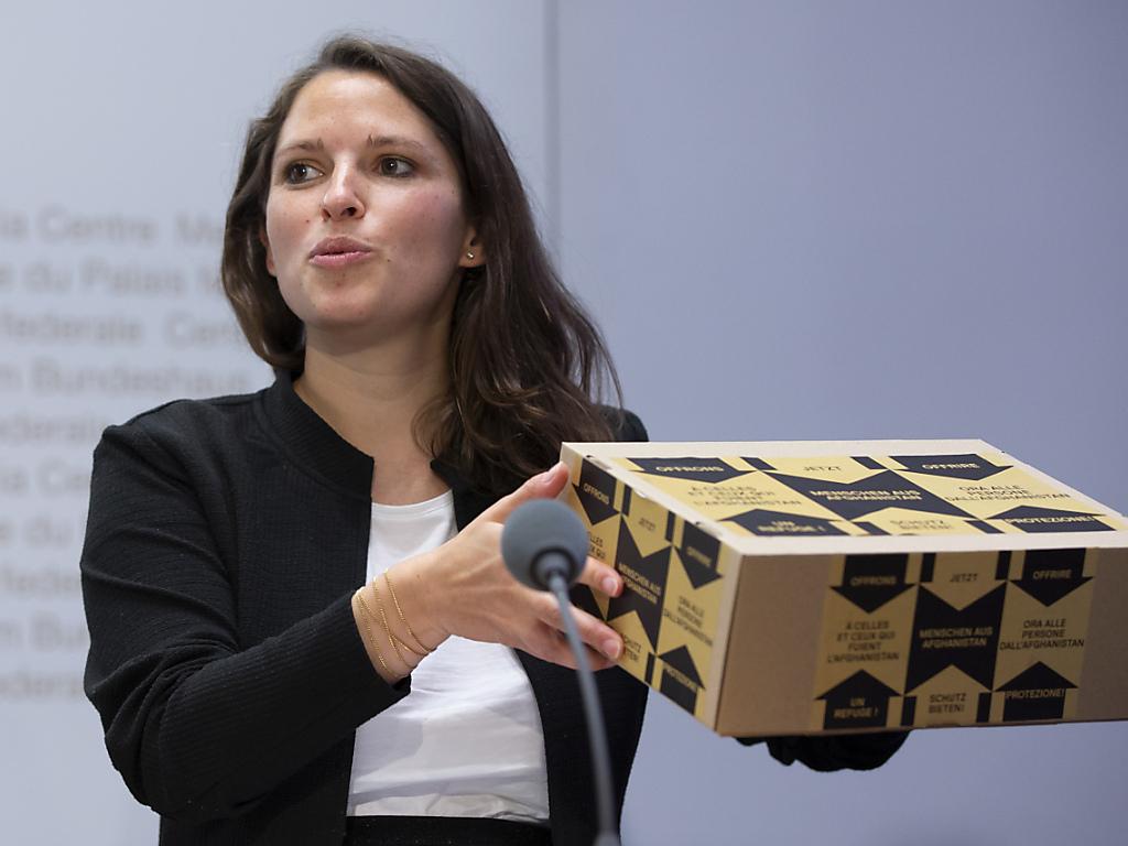 "Alors qu'ici, des milliers d'Afghans ont peur pour leur famille, nous attendons, avec les signataires de l'appel et les villes prêtes à accueillir des réfugiés, que le gouvernement fasse tout son possible pour aider ces personnes", a dit Mattea Meyer, co-présidente du PS Suisse. KEYSTONE/PETER KLAUNZER sda-ats