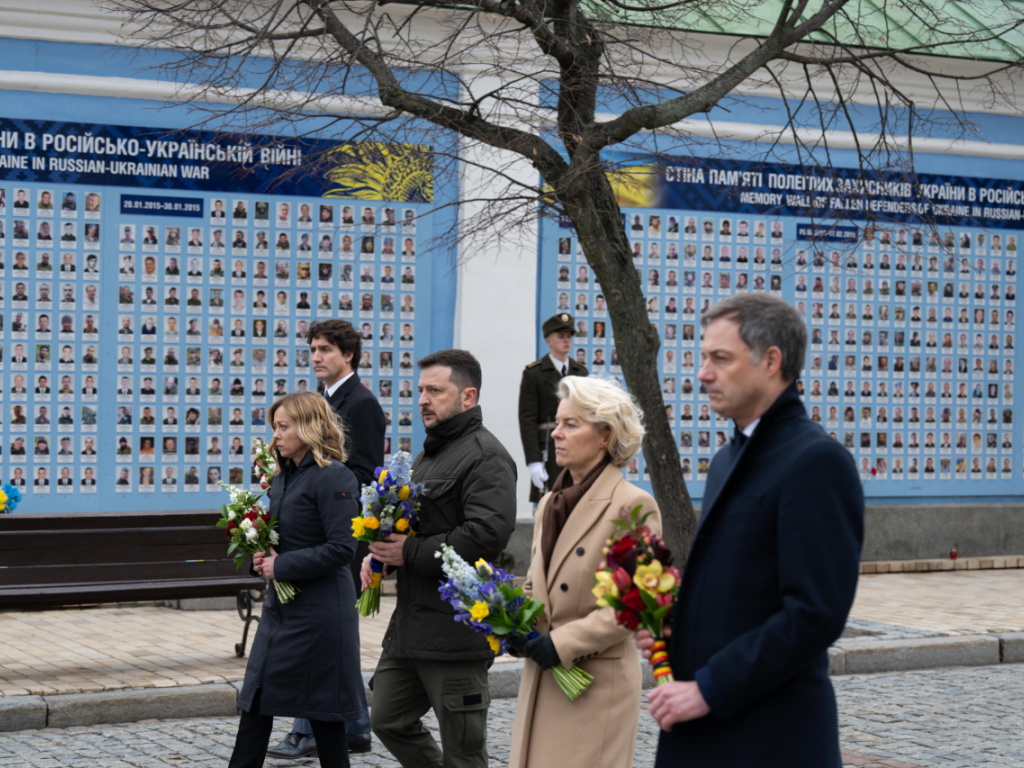 Le président russe Vladimir «Poutine doit perdre absolument tout, comme ici à Gostomel», a-t-il encore dit, depuis l’aérodrome, entouré de la présidente de la Commission européenne Ursula von der Leyen, et des Premiers ministres italienne Giorgia Meloni, canadien Justin Trudeau et belge Alexander de Croo, venus en Ukraine à l’occasion du deuxième anniversaire de l’invasion.