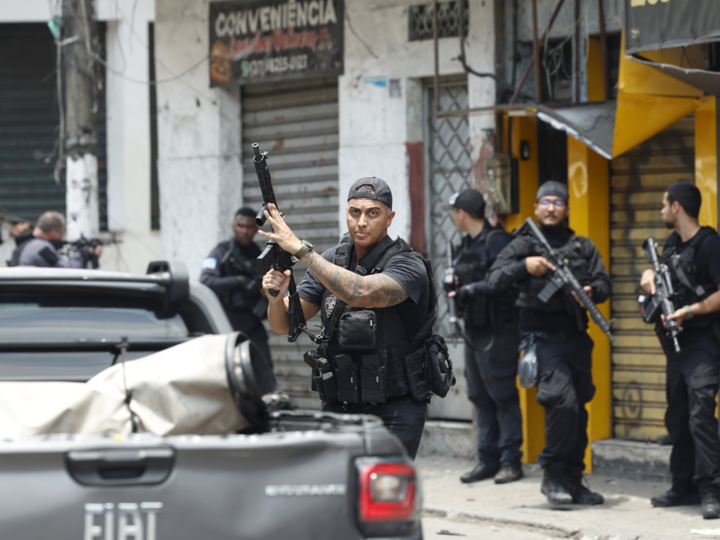 A Vila Cruzeiro, une favela du Complexo da Penha, des policiers lourdement armés gardaient une vingtaine de jeunes hommes interpellés. Serrés les uns contre les autres, ils étaient assis par terre la tête baissée, pieds et torse nus.