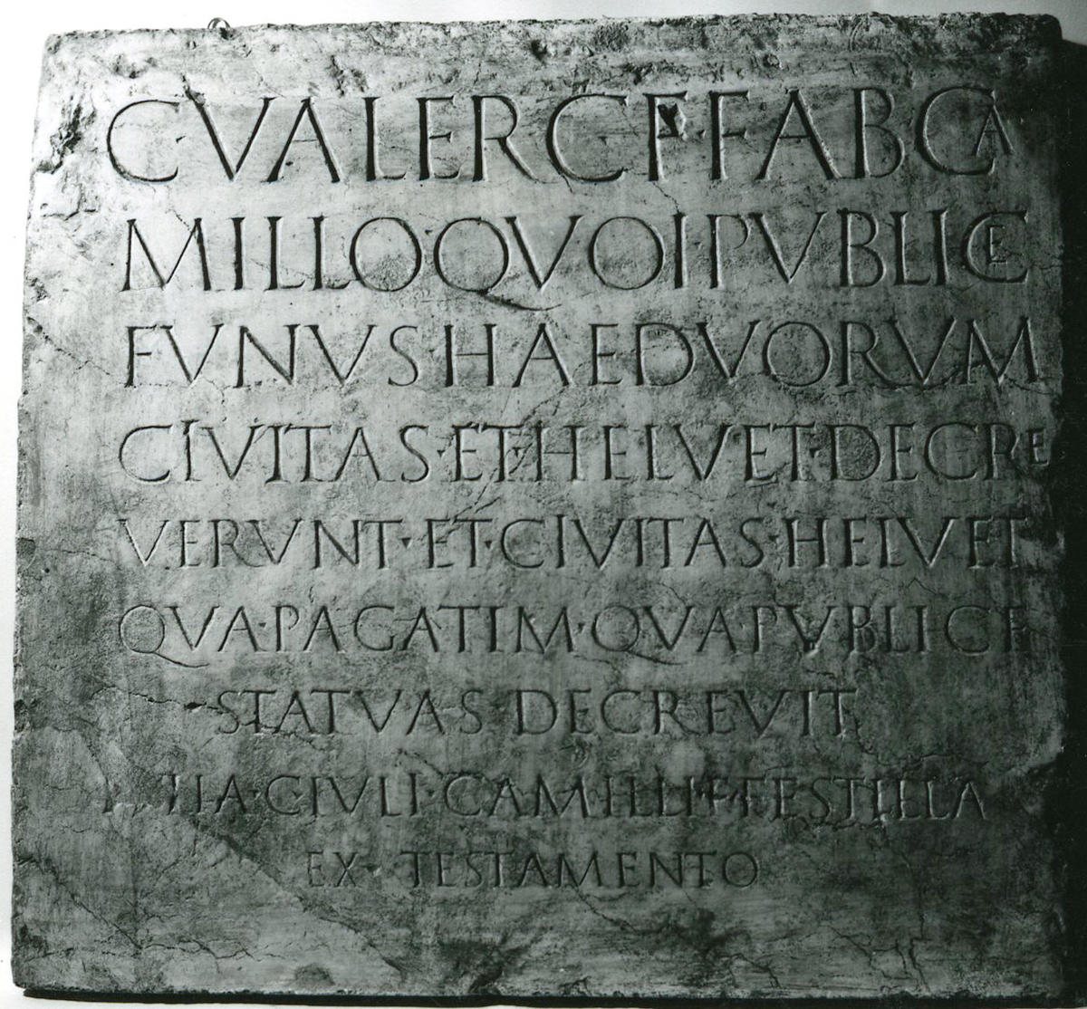 Il est intéressant de noter que la volonté du défunt a été exécutée par une femme, peut-être sa nièce Iulia Festilla. L’épigraphe révèle non seulement de qui il était le fils, mais aussi que Caius Valerius entretenait de toute évidence de bonnes relations avec les Éduens et les Helvètes, les tribus des régions situées au sud et au nord du col de Jougne. En outre, son nom nous confirme également que cette branche de la famille s’est très tôt romanisée. À partir de l’époque impériale, les étrangers utilisaient souvent le gentilice de l’empereur au pouvoir.