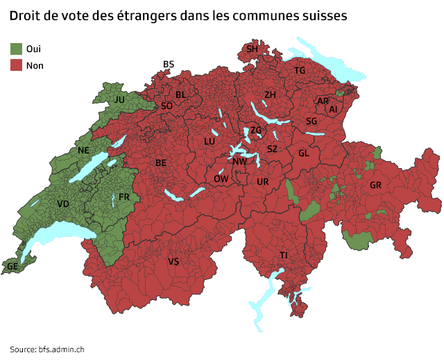 Huit cantons accordent aux étrangers le droit de voter/d’élire au niveau communal: Appenzell Rhodes-Extérieures (pour les communes qui le veulent, système du opting-in), Bâle-Ville (opting-in), Fribourg, Grisons (opting-in), Neuchâtel, Jura, Vaud et Genève.