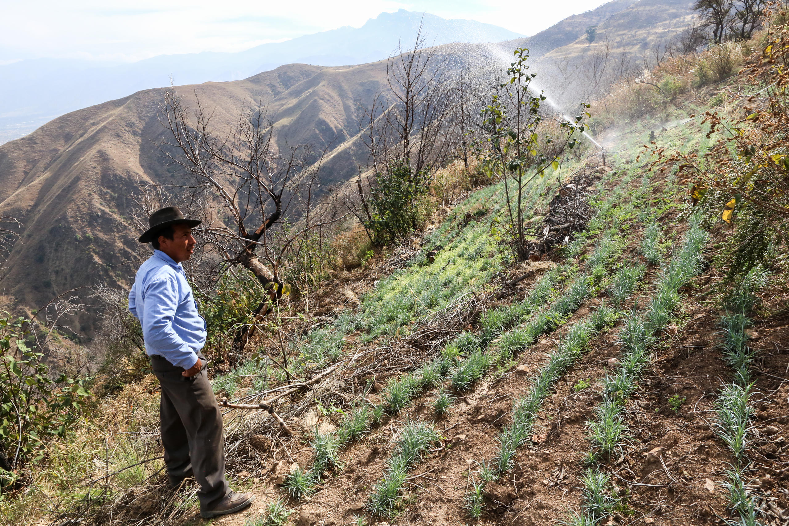 Le système d’aspersion, d’un coût d’environ 1’000 francs, est financé par la Suisse dans le cadre du projet Gestion intégrée de l’eauLien externe, implanté par l’association Helvetas. Certains paysans sont toutefois réticents, souligne M. Vargas: «Ils pensent que l’irrigation par le haut peut endommager les plantes».