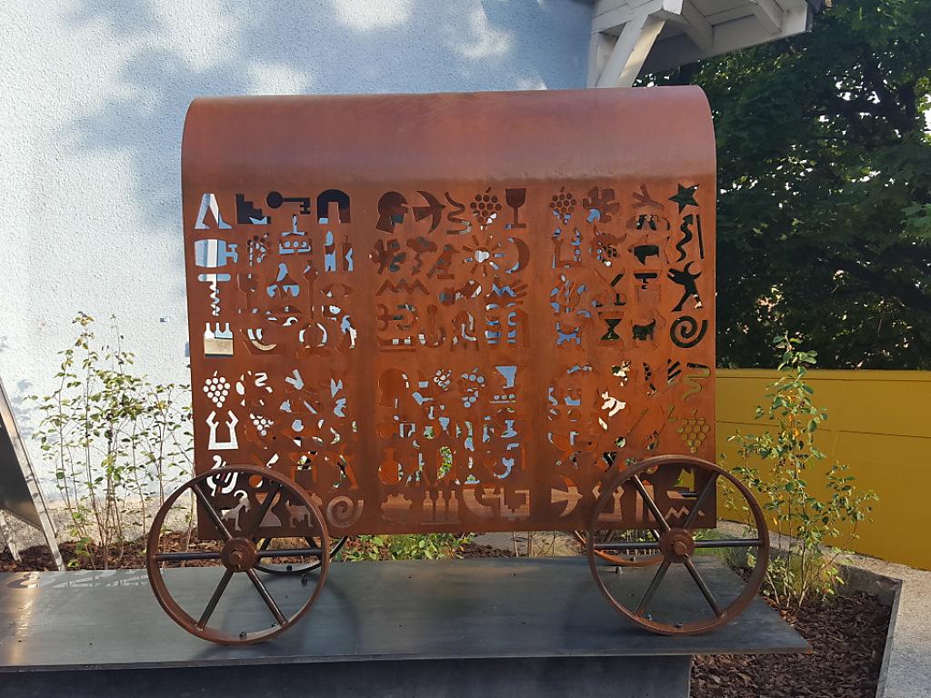 Pour témoigner de leur entreprise courageuse, un chariot stylisé dû au talent de l’artiste lucernois Hugo Schaer a été installé au coeur de Chexbres. Il symbolise le grand départ, les êtres chers que l'on quitte, les biens que l'on prend avec soi, comme une bible ou une carabine.