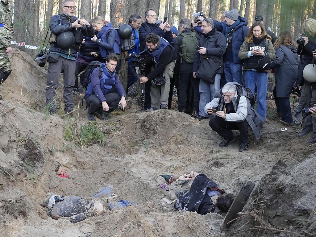 La maire de ce village de Motyzhyn, où a été découverte cette fosse, a été retrouvée morte avec sa famille au fond du jardin de son domicile avec les mains liées derrière le dos. Elle avait refusé de collaborer avec les Russes- KEYSTONE/AP/Efrem Lukatsky sda-ats