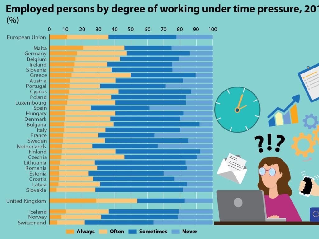 Dans ses statistiques, l’agence Eurostat prend désormais en compte la pression par le temps de travail. Et sa dernière étude montre qu’en Europe, les employés suisses sont ceux qui se plaignent le moins d’être pressés par le temps.
