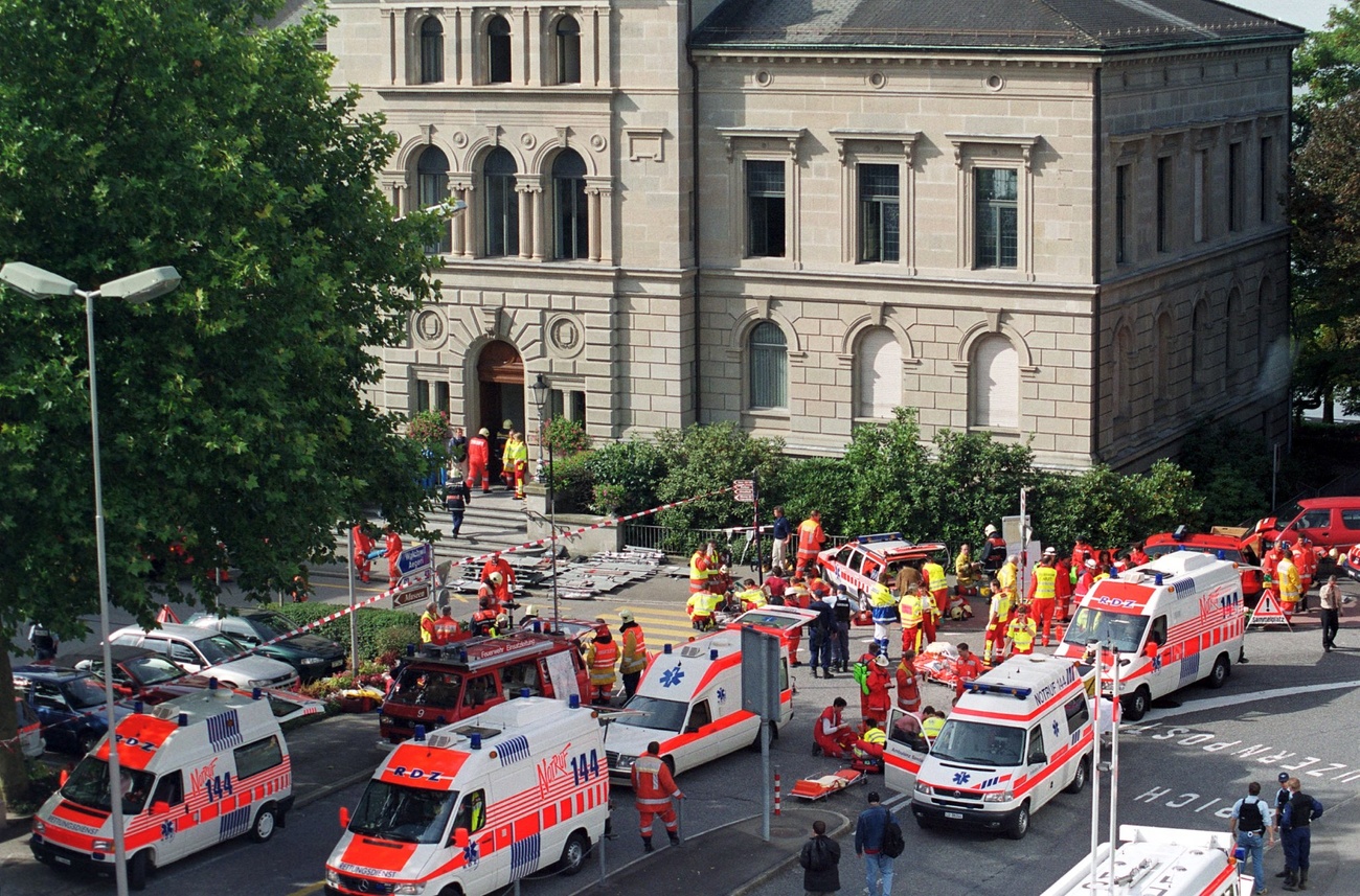 À 10h30, le 27 septembre 2001, Friedrich Leibacher fait irruption dans la salle du Parlement du canton de Zoug. L’homme ouvre le feu, tuant 11 députés et trois conseillers d’État, avant de se donner la mort. L’attentat a eu d’importantes conséquences sur la vie politique suisse: alors qu’on pouvait entrer dans le Palais fédéral presque comme dans un moulin, la sécurité a été renforcée.