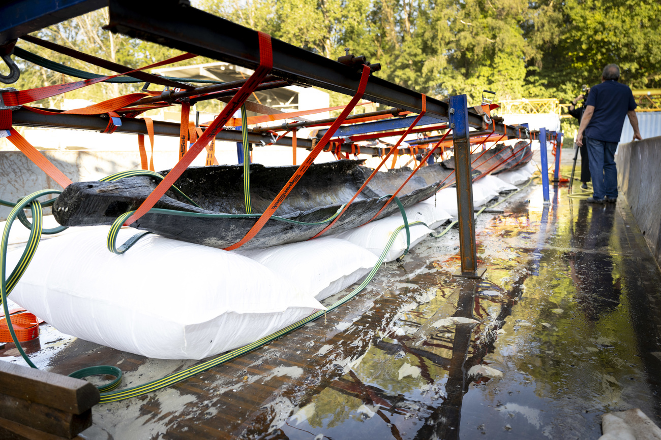 L’embarcation de plus de 12 mètres, fabriquée en un seul morceau de bois, reposait à 3,5 mètres sur un banc de sable de la rive nord du lac. La localisation et la découverte de la pirogue avaient déjà été faites en 2021, avec un dirigeable qui effectuait de la prospection archéologique autour du lac. Sa sortie de l’eau a cependant eu lieu vendredi dernier et a nécessité plusieurs mois de préparation pour ne pas abîmer l’objet.