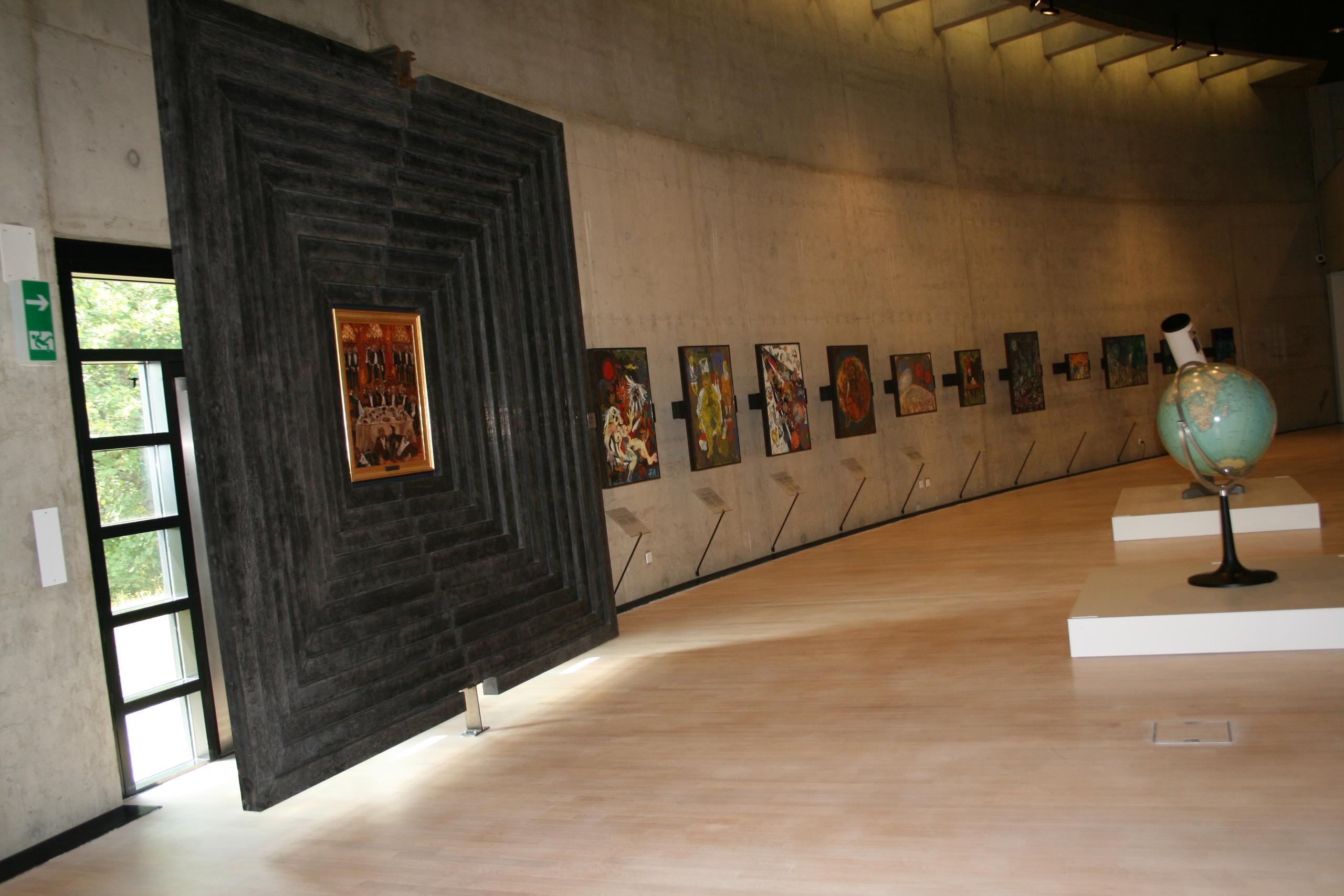 Avec une exception, «Ultime assemblée générale de l’établissement bancaire fédéral», huile montrant des banquiers qui se suicident collectivement. «Il s’agit d’un petit tableau grotesque et ironique auquel Dürrematt avait donné un cadre en or, explique Mario Botta. Nous avons souligné ce cadre symbolique en lui donnant un aspect monumental, pour marquer l’idée d’un testament politique ou idéologique.»