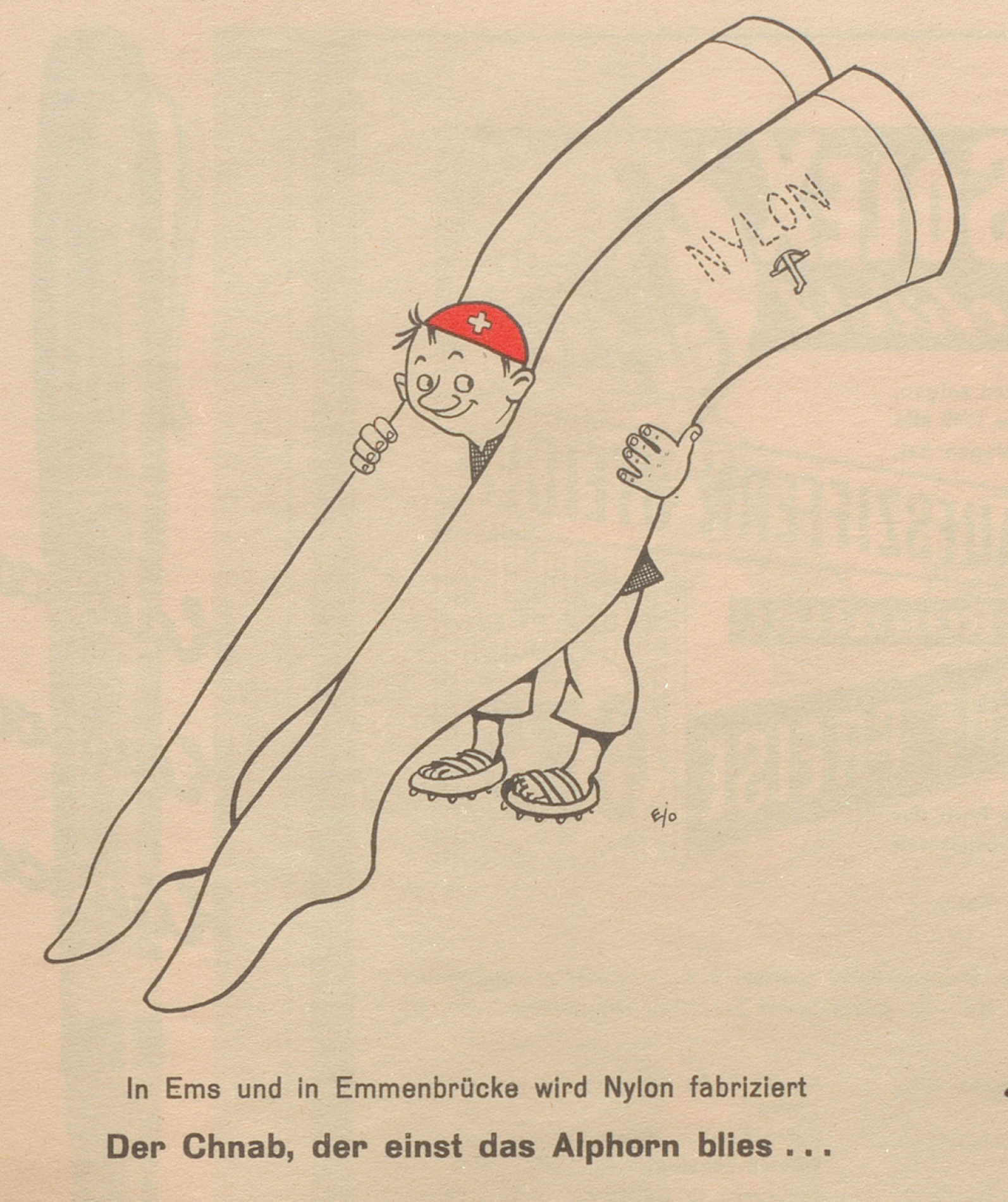 Le 15 mai 1940, des milliers d’Américaines prennent d’assaut les grands magasins pour acquérir les premiers bas en nylon. Par analogie au D-Day, ce jour est entré dans l’histoire sous le nom de «N-Day», avec N pour nylon. La fibre synthétique nylon avait été brevetée par le géant américain de la chimie DuPont peu avant la Seconde Guerre mondiale. Peu après, la multinationale chimique allemande I.G. Farben a développé une variante du nylon appelée perlon. La Suisse a fait de même, avec un peu de retard. En février 1950, le journal bernois Der Bund rapporte que la société HOVAG est la première entreprise suisse à travailler au développement d’une fibre synthétique. Son nom de marque serait «grilon» – une contraction des mots nylon et Grisons, le canton où est produit ce matériau.