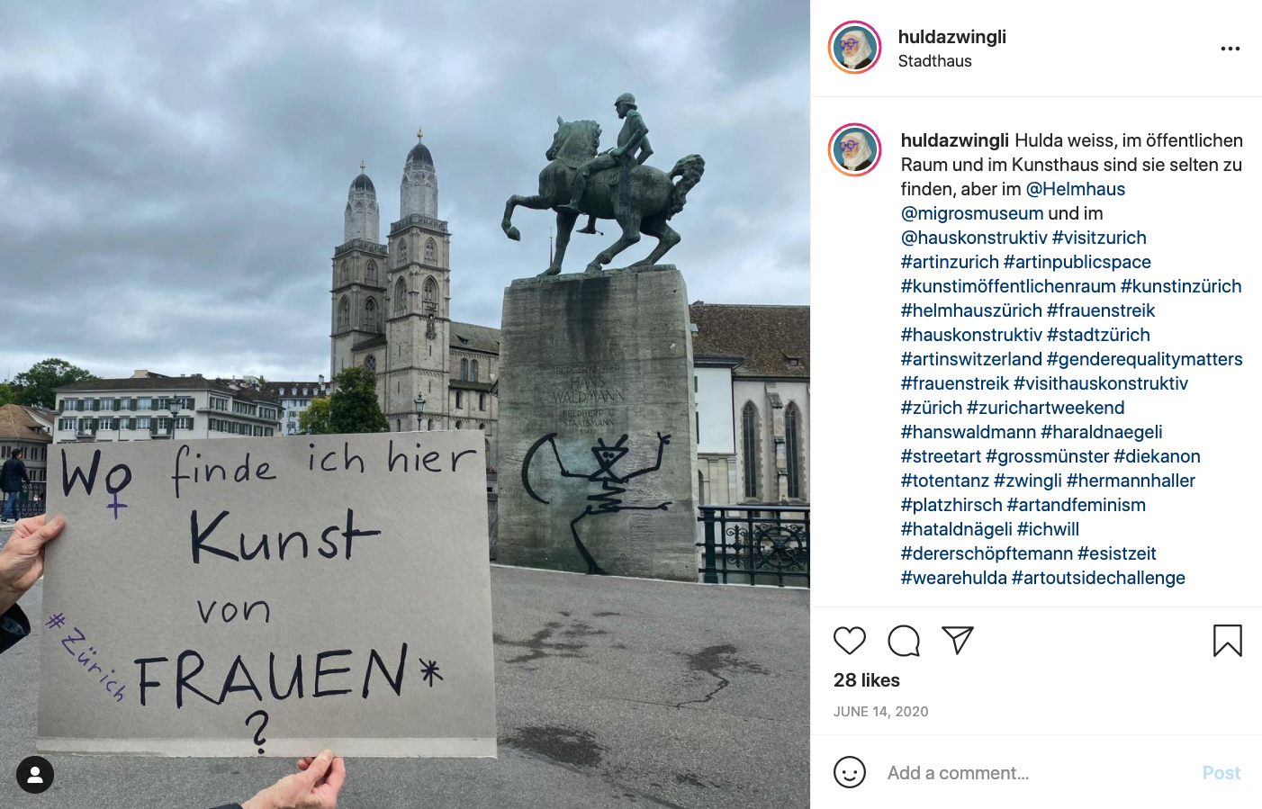 Plutôt que des masques de gorille, ce collectif – dont l’action rappelle les célèbres Guerrilla girls qui dans les années 1980 avaient lancé ce mouvement revendicatif aux Etats-Unis – a opté pour la création d’un personnage fictif au nom très symbolique, Hulda Zwingli, qui utilise les réseaux sociaux pour publier les questionnements soulevés par ses balades le long de la Bahnhofstrasse ou de l’Europaallee, deux célèbres rues zurichoises.