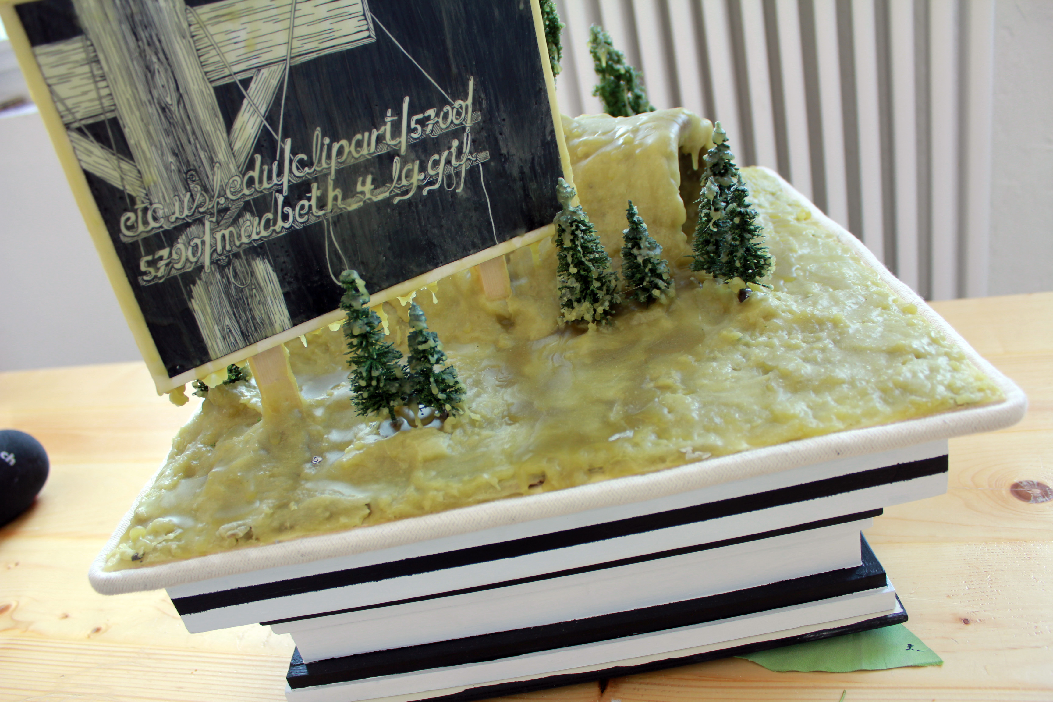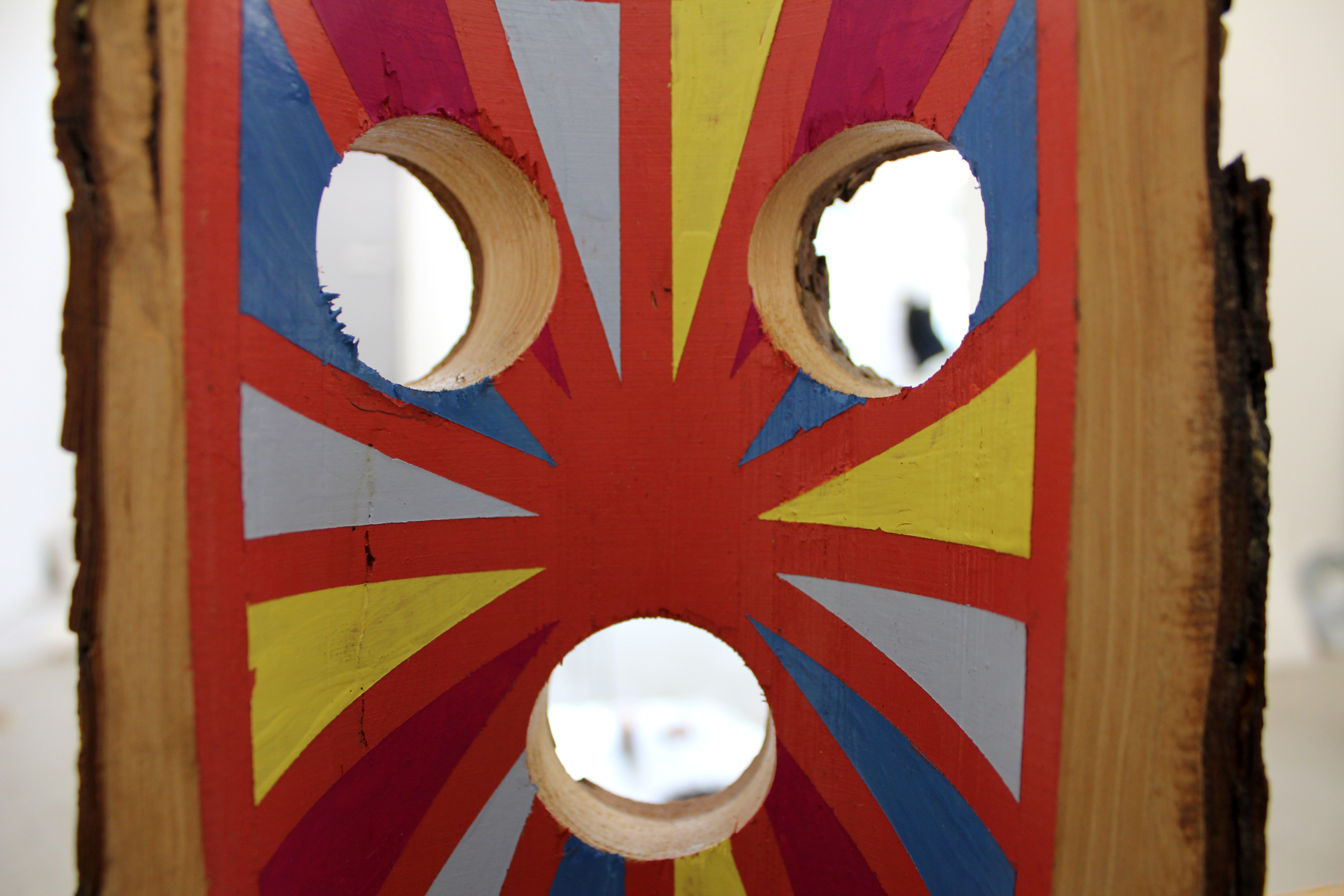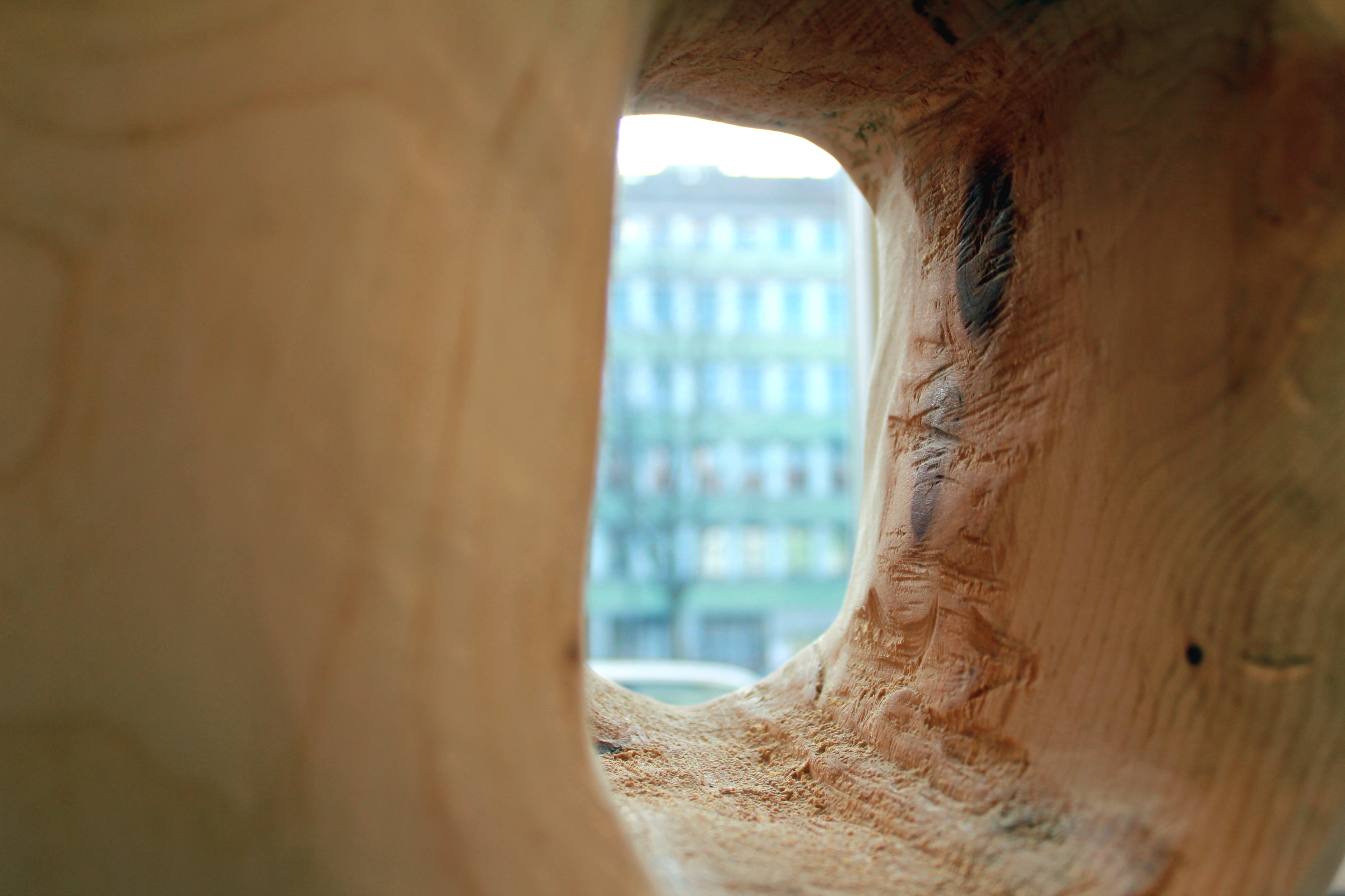 Coup d'oeil sur la ville à travers le bois tronçonné de Claudia Comte.