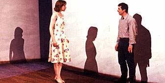 La théâtralisation reste bannie, la sobriété est de mise, y compris dans le décor: trois pans de mur blancs et un sol en pente douce, qui oblige les acteurs à freiner leurs pas.