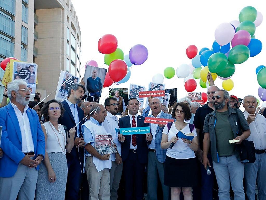 De nombreuses personnes s'étaient rassemblées devant le tribunal dans la matinée, procédant à un lâcher de ballons multicolores et scandant: "la presse libre ne peut être réduite au silence". KEYSTONE/EPA/ERDEM SAHIN sda-ats