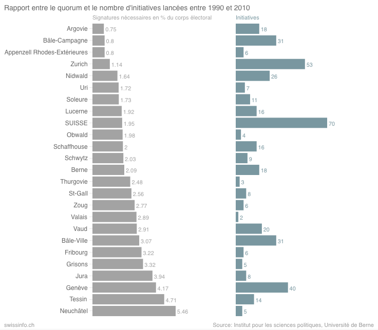Dans le passé, les comparaisons entre cantons n’ont pas montré de relation directe claire entre ces conditions et le nombre d’initiatives soumises au vote. Une analyse comparative pour la période 1990-2010, réalisée par Marc BühlmannLien externe, professeur à l’Université de Berne, montre qu’il existe des cantons avec un quorum de signatures élevé, où plus d’initiatives ont abouti que d’autres avec un seuil inférieur, comme l’illustre le graphique ci-dessous.