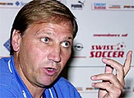 Le coach national Enzo Trossero annonçant la composition de l'équipe de Suisse. Keystone