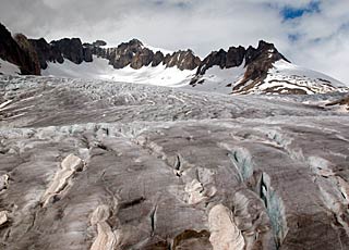Nous n'en sommes plus qu'à quelques kilomètres. C'est de cet amas de glace sale (mais tous les glaciers sont sales en surface) que sortent les eaux du Rhône.