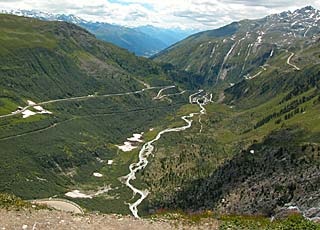 Du pied du glacier, si l'on regarde vers le fond de la cuvette de Gletsch, on voit que le Rhône récolte les eaux de tous les petits ruisseaux alentour.