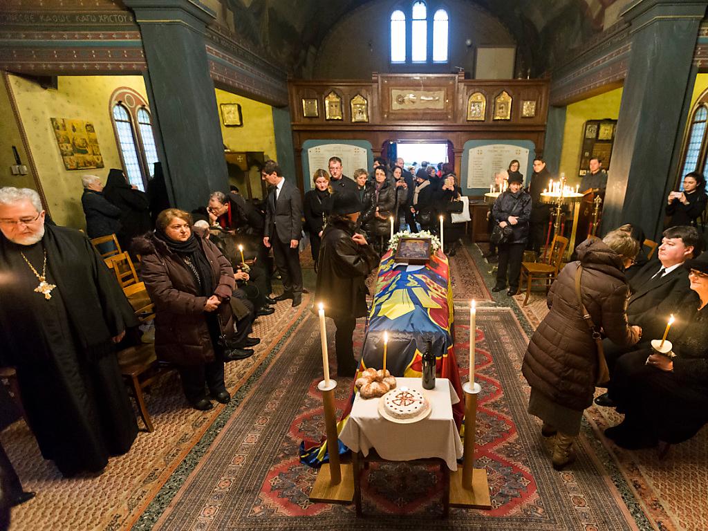 Des couronnes de fleurs blanches entourent le cercueil posé au centre de la petite église orthodoxe. Quatre télévisions roumaines sont présentes et ont retransmis la messe donnée durant l’après-midi en grec, en roumain et en français.