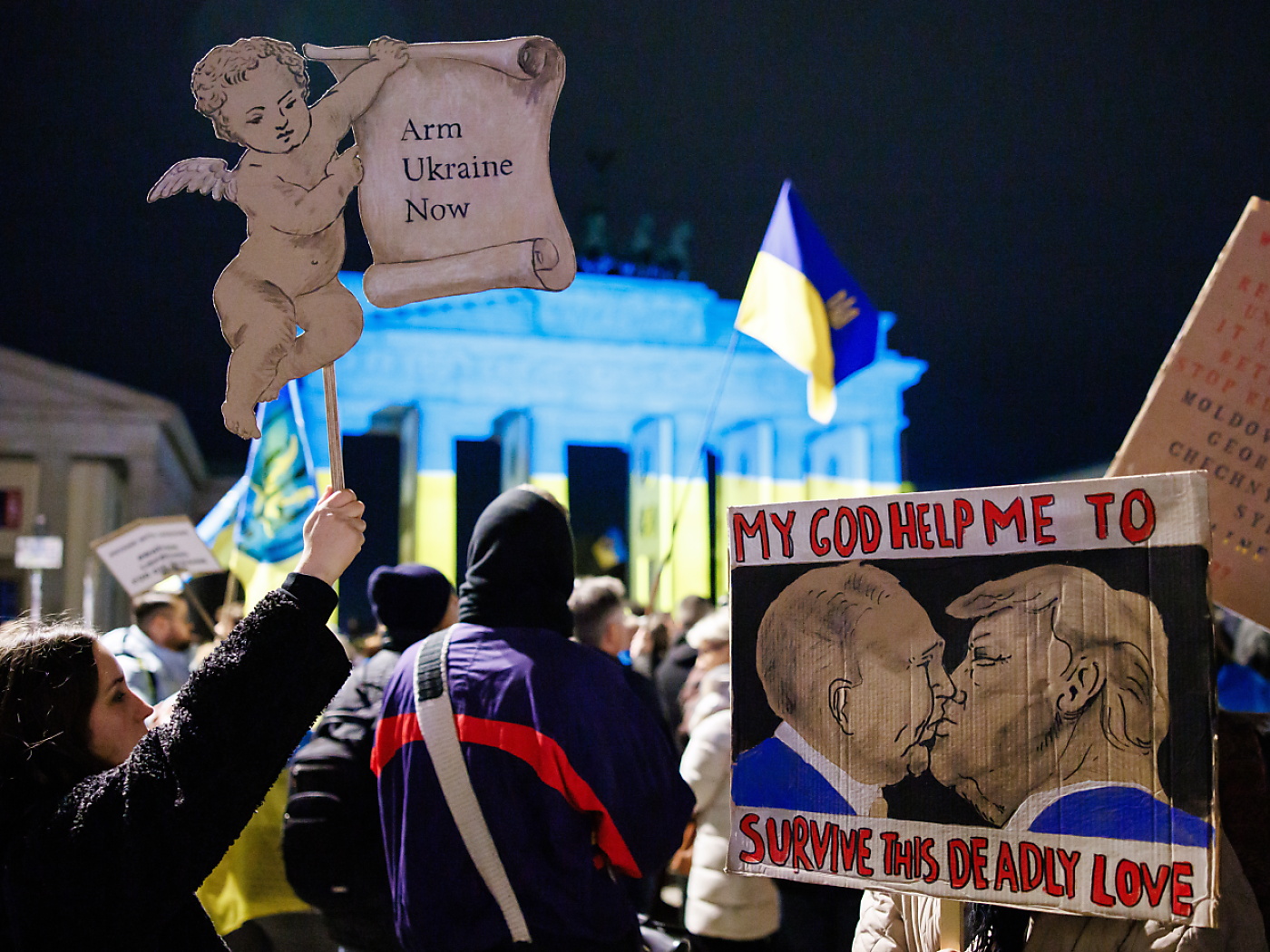 (Keystone-ATS) «La Russie est un Etat terroriste», scandaient les manifestants, dont beaucoup portaient un drapeau ukrainien sur les épaules. Les participants ont défilé devant l’ambassade de Russie, avant de se rassembler devant la Porte de Brandebourg toute proche, illuminée aux couleurs bleue et jaune de l’Ukraine.