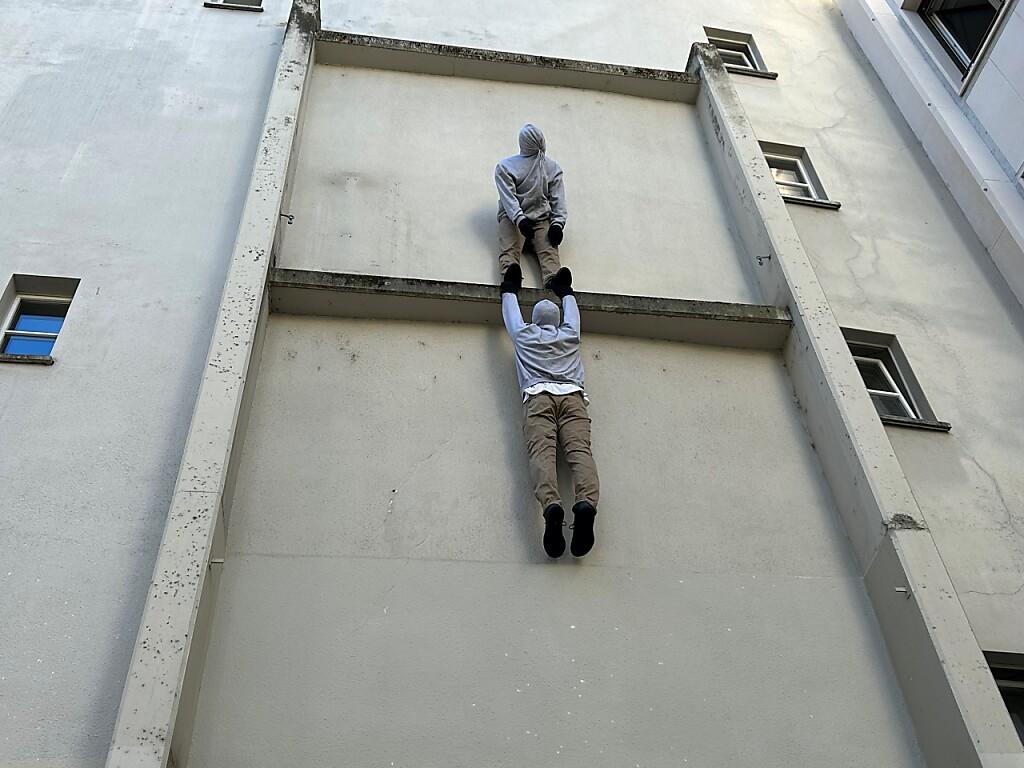 Vêtus de pantalons beiges et de sweat-shirts gris, la capuche rabattue sur le visage, deux personnages sont suspendus, immobiles, à un rebord du mur d’un immeuble situé entre Gerbergässlein et Rümelinsplatz.