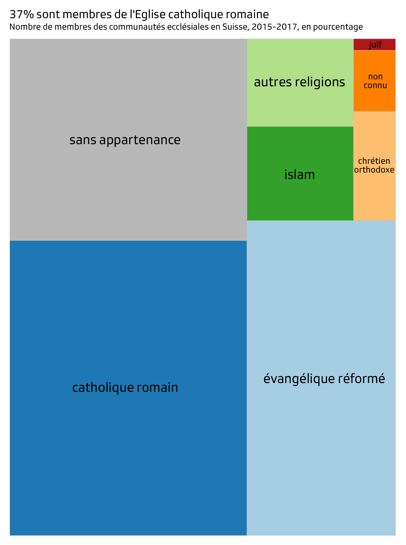 Les statistiques officielles ne reflètent toutefois pas la diversité religieuseLien externe réelle du pays: les mouvements dissidents issus du christianisme et des religions orientales, les groupes ésotériques et les sectes ont trop peu d’adhérents pour occuper une place significative dans les graphiques. La Suisse compte pourtant environ 150 églises évangéliques avec ses quelque 9’500 adeptes et des centaines de sectes, selon la définition donnée à ces groupes dissidents.