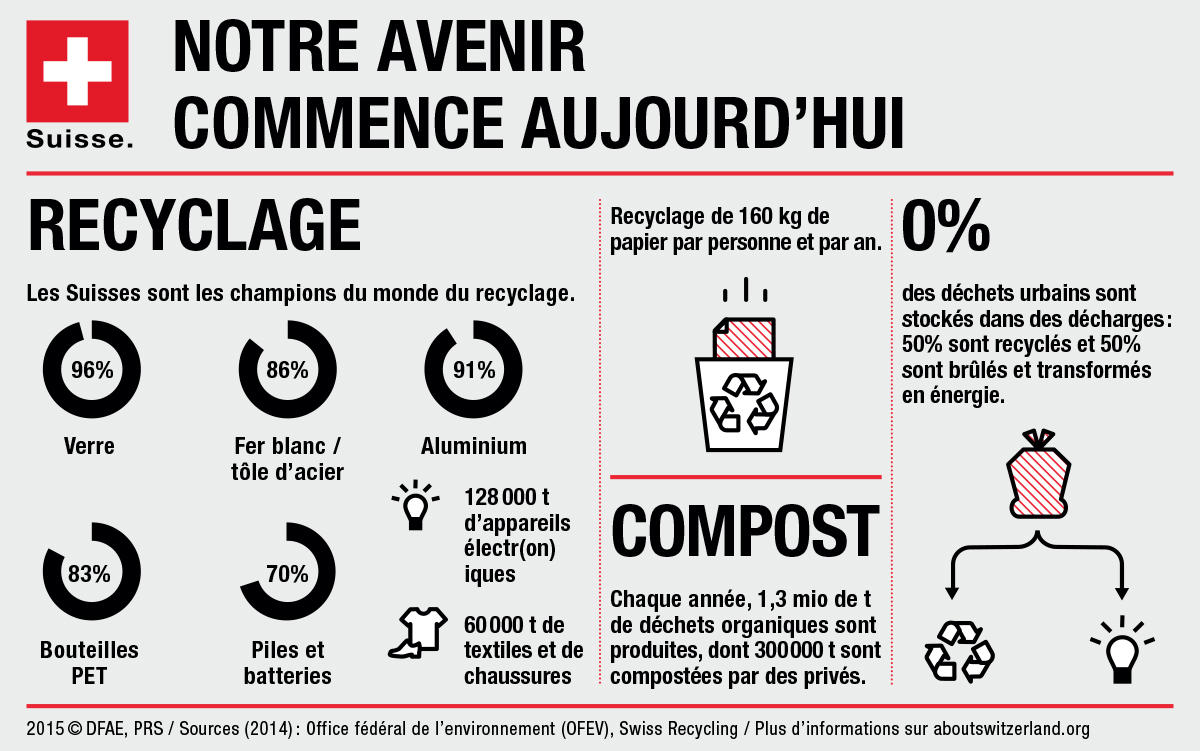 Parmi eux, economiesuisse a affirmé dans un communiqué de presseLien externe que la Suisse, «élève modèle en matière de recyclage, atteint des taux dont les autres pays d’Europe ne peuvent que rêver.» Dans un document politique ultérieur, qui énumère les arguments contre l’initiative, l’organisation faîtière des entreprises a publié une infographie affichant des taux de recyclage impressionnants, qui montre que la Suisse est déjà «championne du monde» du recyclage.