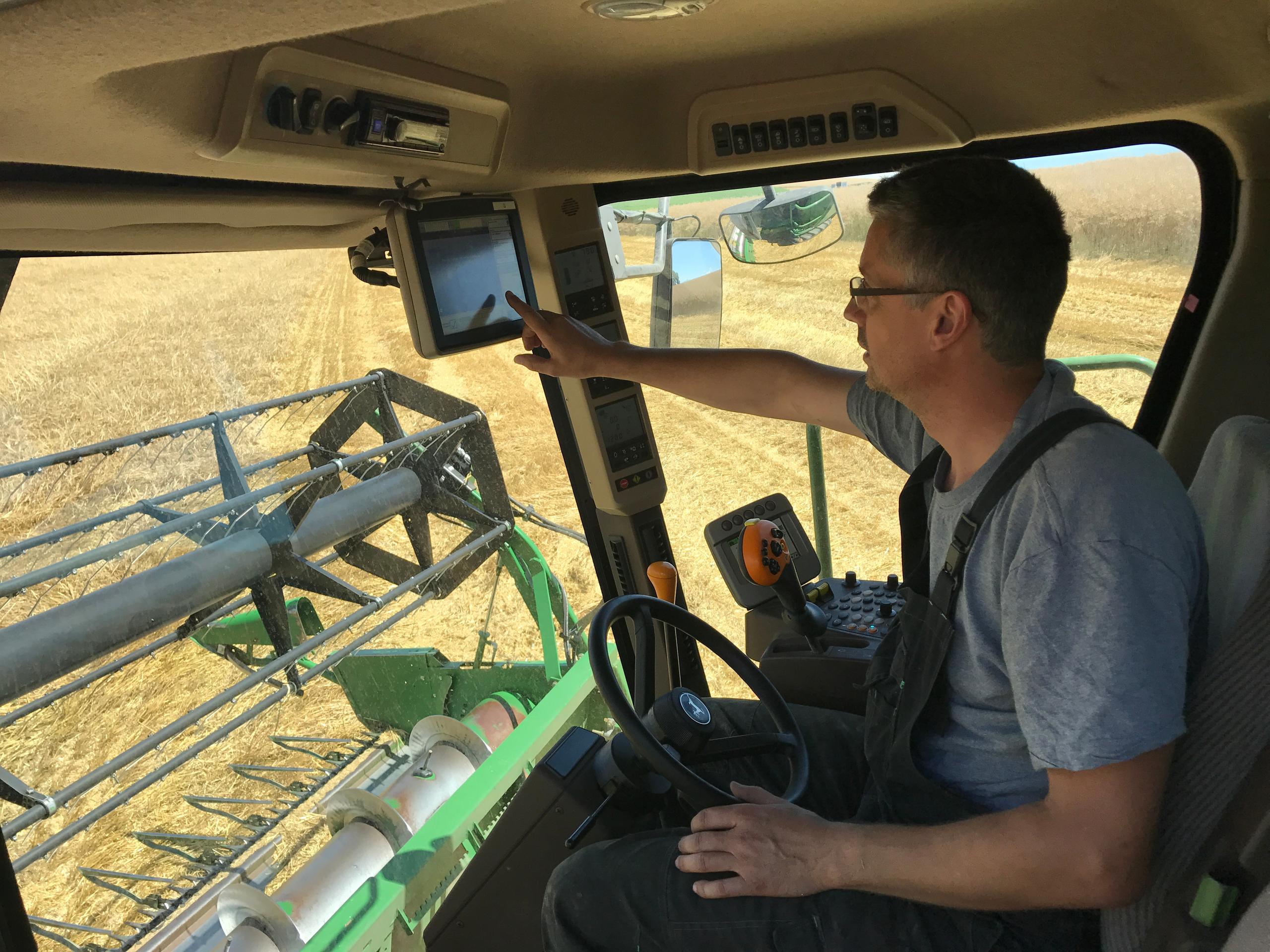 Assis confortablement dans la cabine climatisée de sa moissonneuse-batteuse dotée d’un système de guidage automatique (voir vidéo ci-dessous), Cédric RomonLien externe, patron d’une entreprise de travaux agricoles de la région lausannoise, a déjà une idée bien précise de l’utilité de ces données, puisqu’il en récolte lui-même une quantité importante au quotidien. «Je peux livrer des indications précises au propriétaire de la culture sur le rendement de chaque portion de terrain, la qualité ou encore l’humidité des grains de céréales récoltés», indique-t-il.