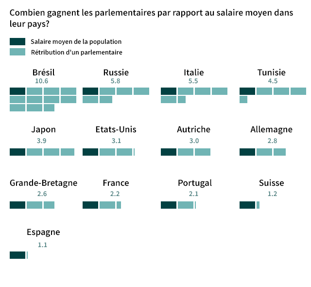 En mettant en relation le salaire moyen des citoyens lambda et des parlementaires, il apparaît que ce sont les députés brésiliens qui sont les mieux lotis. Ces derniers gagnent près de dix fois plus que le salarié moyen brésilien. Les députés espagnolsLien externe sont quant à eux les moins bien rémunérés en Europe occidentale: leur salaire fixe est pratiquement identique au salaire moyen de leurs compatriotes.