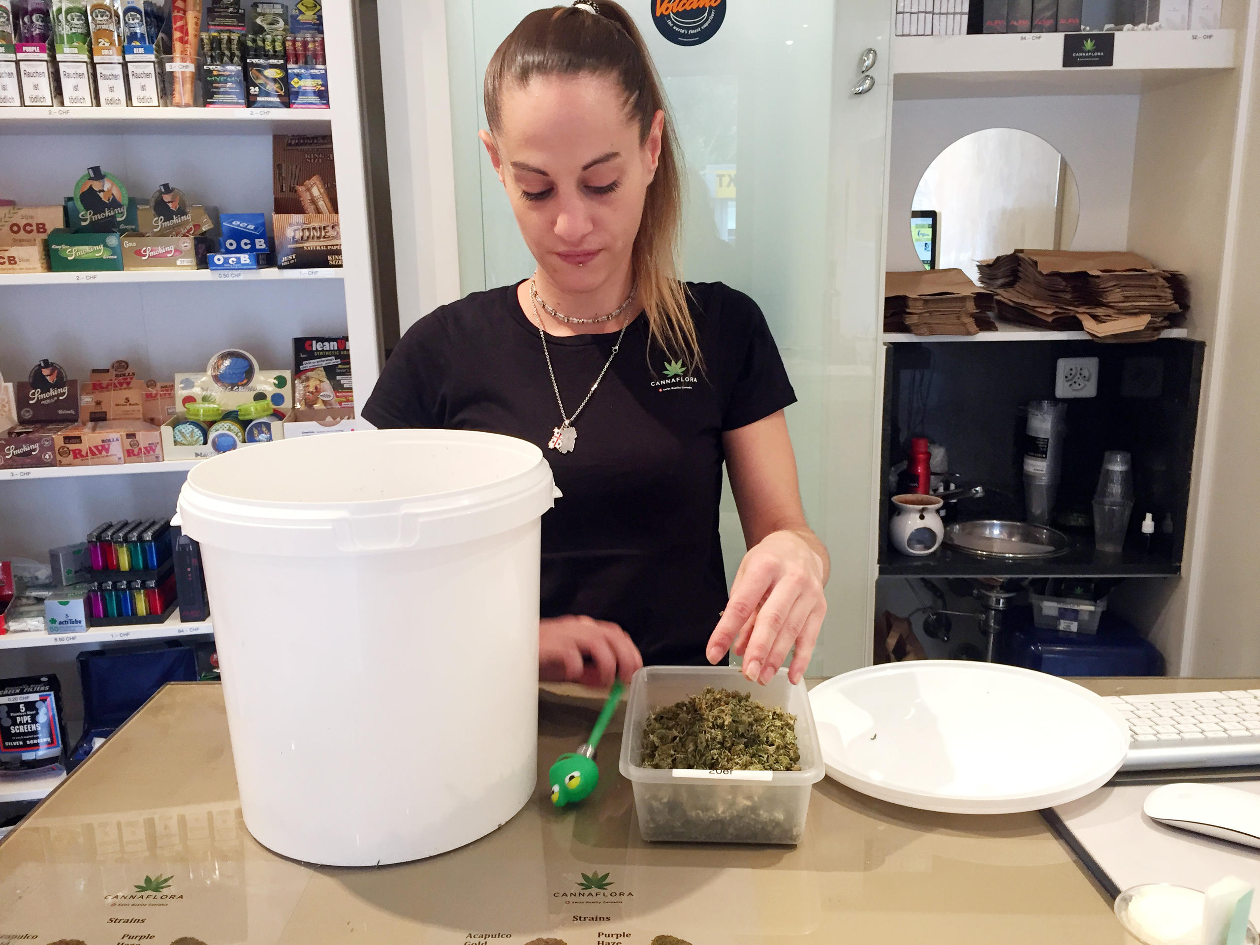 Une femme de 50 ans portant un cabas à commission entre justement dans le magasin, elle renifle le contenu d’un des pots transparents. «Je fume ça le soir pour me détendre.» L’âge des clients de Cannaflora va de 18 à 70 ans, indique Sandrine. Et ils viennent des quatre coins de la société: des hommes et des femmes en costume-cravate font aussi leurs emplettes ici, tout comme ceux en habits de travail.