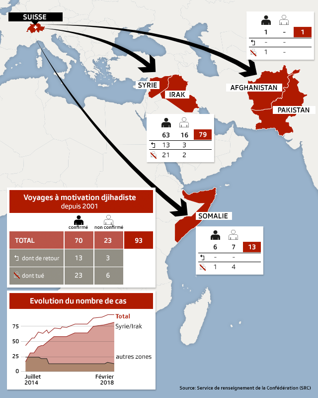 Une centaine de personnes – 93 selon le Service de renseignement de la Confédération (SRC) – ont quitté la Suisse ces dernières années pour aller faire le djihad en Syrie, en Irak, en Somalie, en Afghanistan ou au Pakistan. Jusqu’ici, 29 d’entre elles sont mortes sur place et 16 sont de retour en Suisse.
