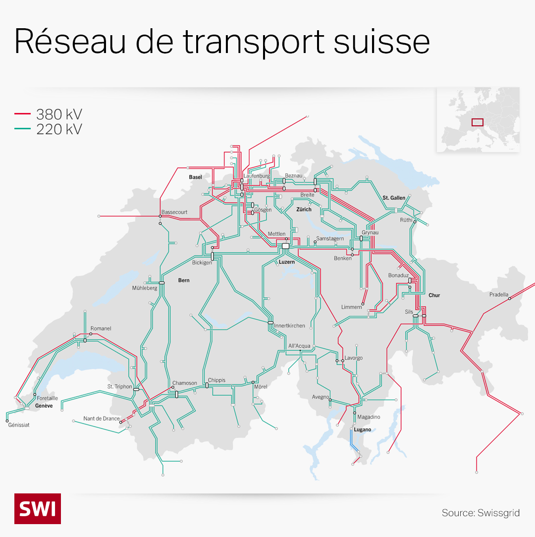 Le réseau de transport suisse exploité par Swissgrid (lignes de 380’000 volts en rouge, de 220’000 volts en vert) s’étend sur 6700 km et constitue l’épine dorsale du système électrique. Kai Reusser / swissinfo.ch