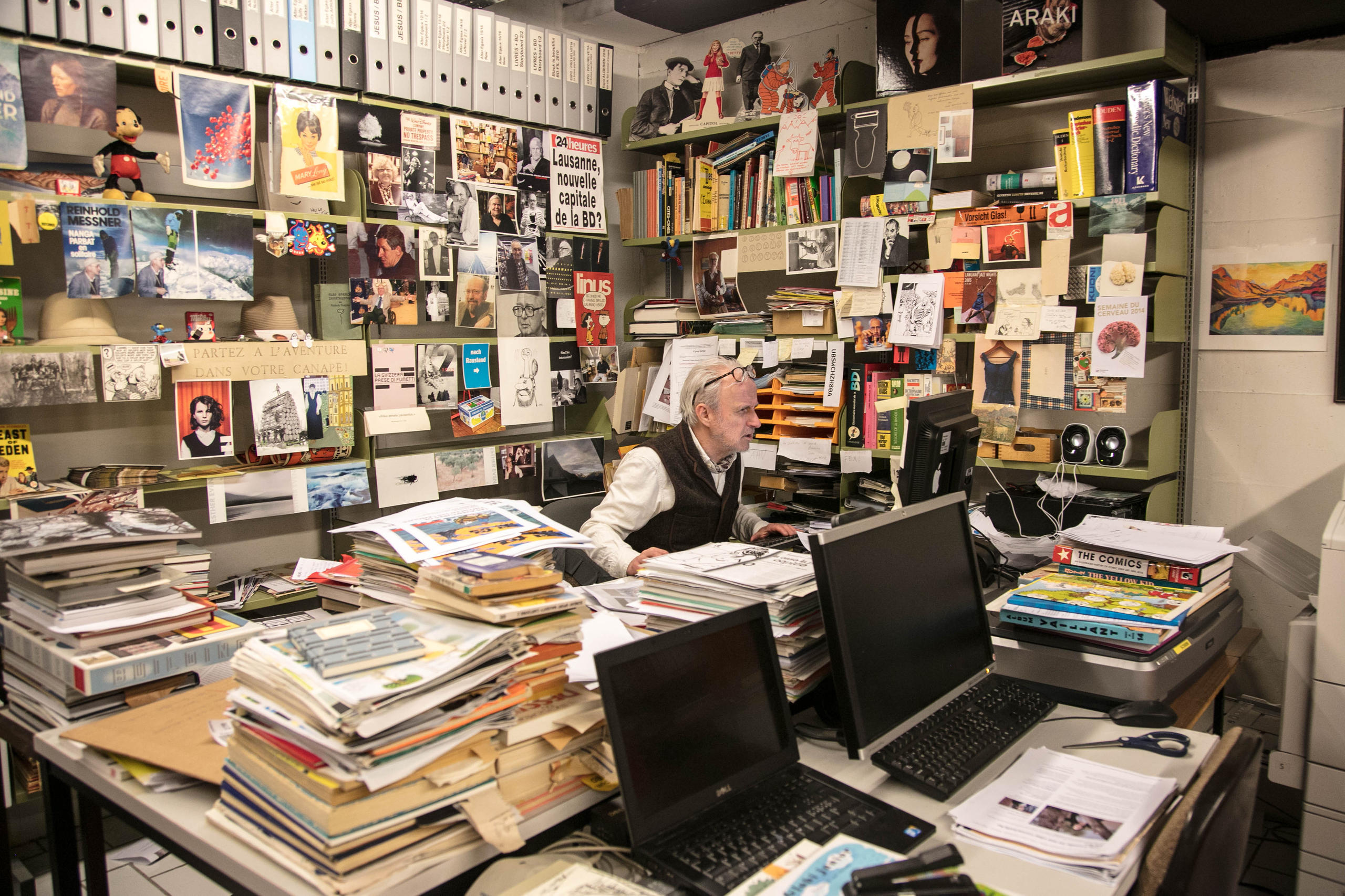 «Les bandes dessinées constituent un médium ancien aujourd’hui». reconnaît-il en ouvrant les portes de son trésor conservé dans les espaces de rangement souterrains de la bibliothèque municipale de Lausanne. Il s’agit de montagnes de BD, récentes ou plus anciennes, dans différentes langues.