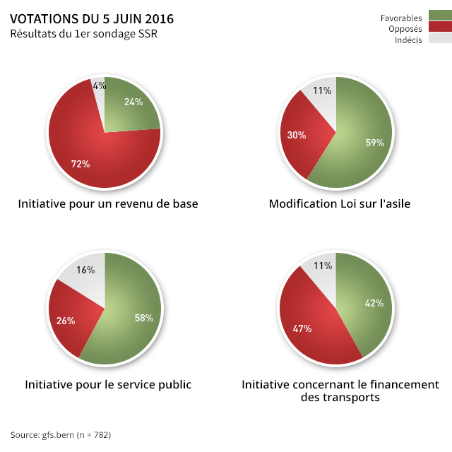 «Non» aux initiatives populaires sur le revenu de base inconditionnel et sur le financement des transports; «oui» à l’initiative en faveur du service public et à la révision de la Loi sur l’asile: ce sont les résultats du 1er sondage SSR sur quatre objets soumis au vote le 5 juin. Mais seul le sort du revenu de base est d’ores et déjà définitivement scellé.