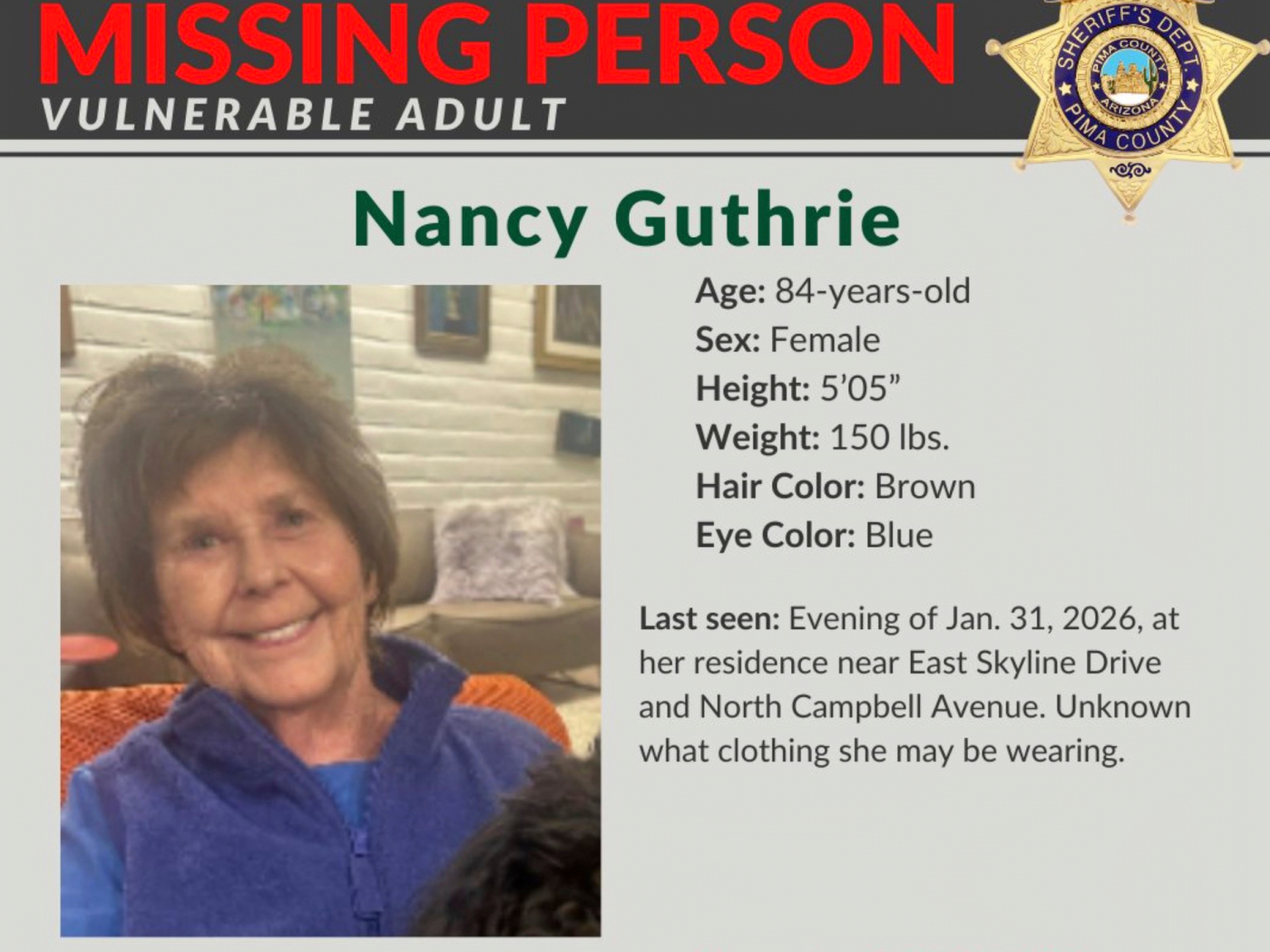 Nancy Guthrie a été vue pour la dernière fois à son domicile près de Tucson, dans l’Arizona, samedi soir. Des gouttes de sang retrouvées à l’entrée de sa maison lui appartiennent, a annoncé jeudi le shérif local, qui privilégie la thèse de l’enlèvement. Il avait auparavant décrit la demeure comme une «scène de crime».