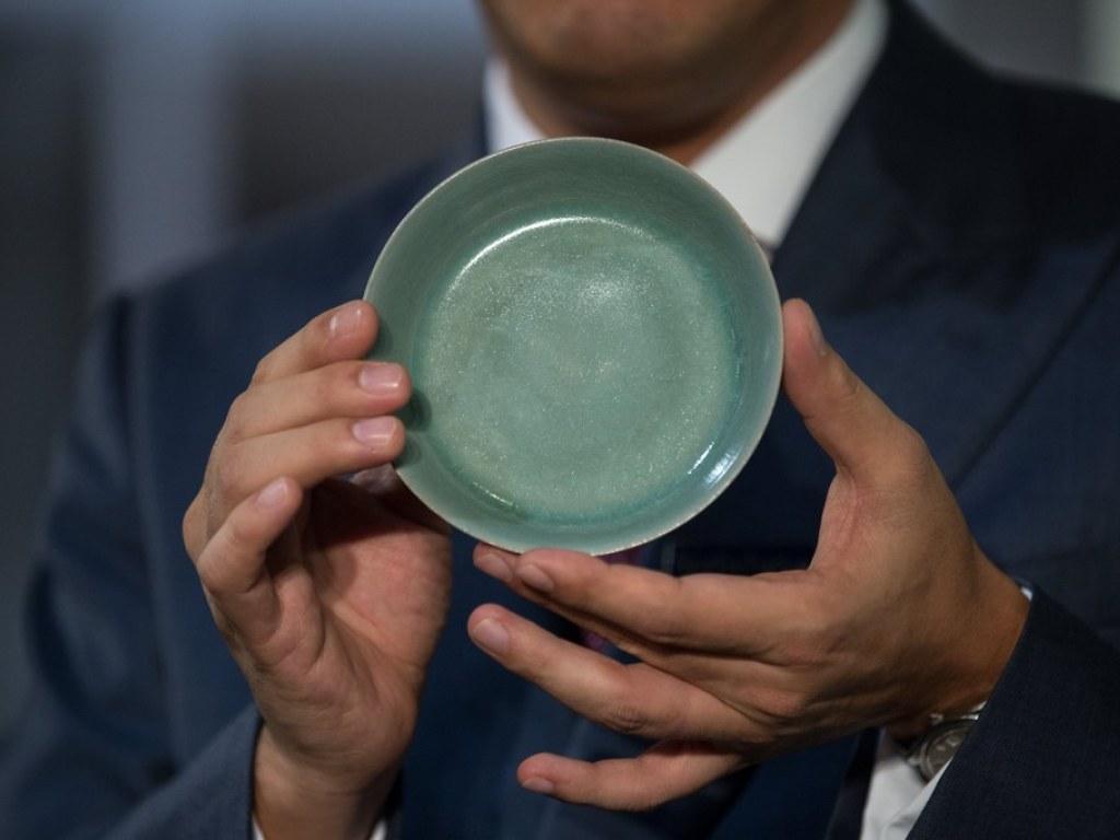 Le bol, destiné initialement à laver les pinceaux, est l'une des rares pièces de porcelaine chinoise issues de la cour impériale de la dynastie Song du Nord. Seules quatre porcelaines, dont ce bol d'un bleu lumineux, appartiennent à des collectionneurs privés. Keystone/EPA/JEROME FAVRE sda-ats