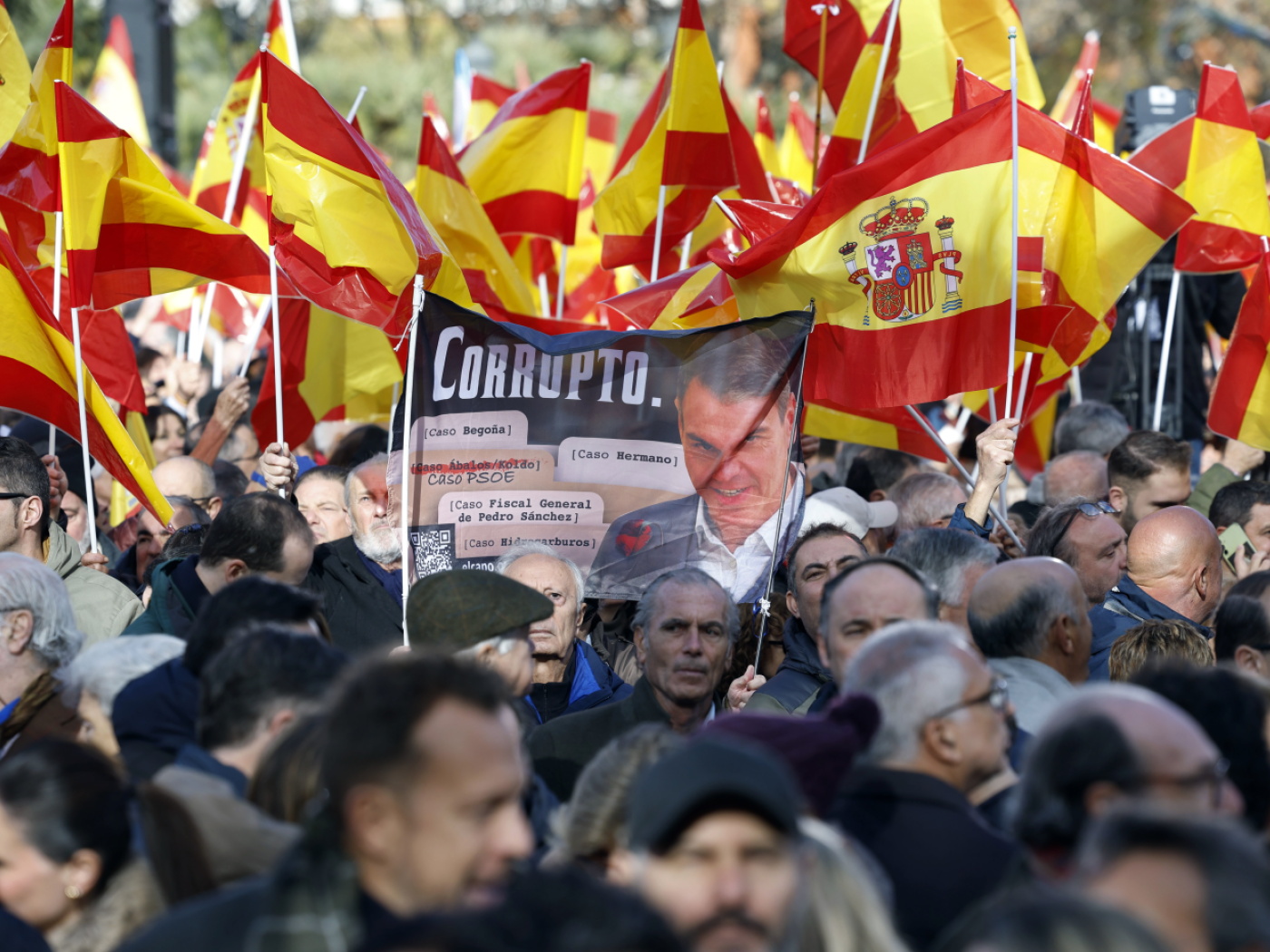 «Le ‘Sanchisme’ est en prison et doit être chassé du gouvernement», a-t-il encore tancé face à une foule compacte brandissant des drapeaux espagnols, après avoir énuméré les affaires judiciaires qui touchent notamment la conjointe et le frère de Pedro Sánchez, dans des dossiers distincts.