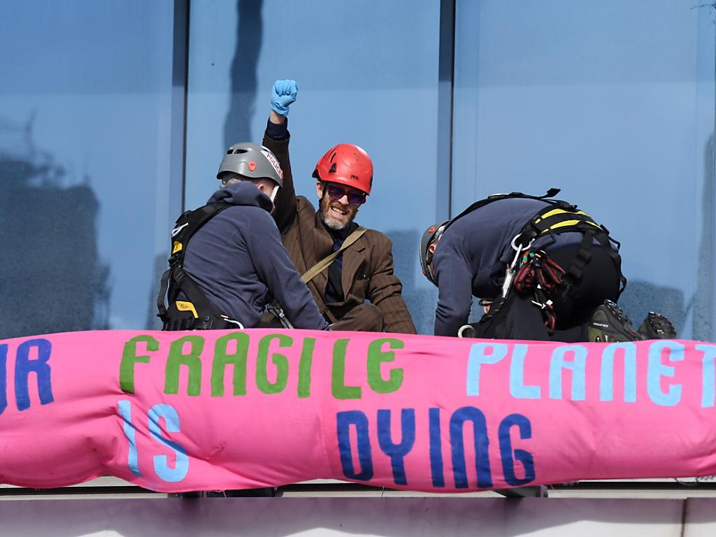 Deux militants sont montés sur le toit de l’entrée de l’aéroport, où a été accrochée une banderole rose proclamant «Notre fragile planète est en train de mourir».