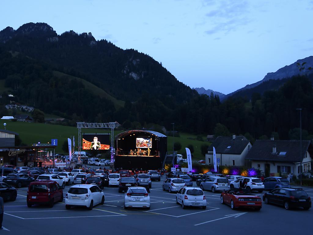 Une quarantaine de voitures ont assisté au coup d'envoi du premier festival de musique classique sous forme de drive-in à Charmey. KEYSTONE/ANTHONY ANEX sda-ats