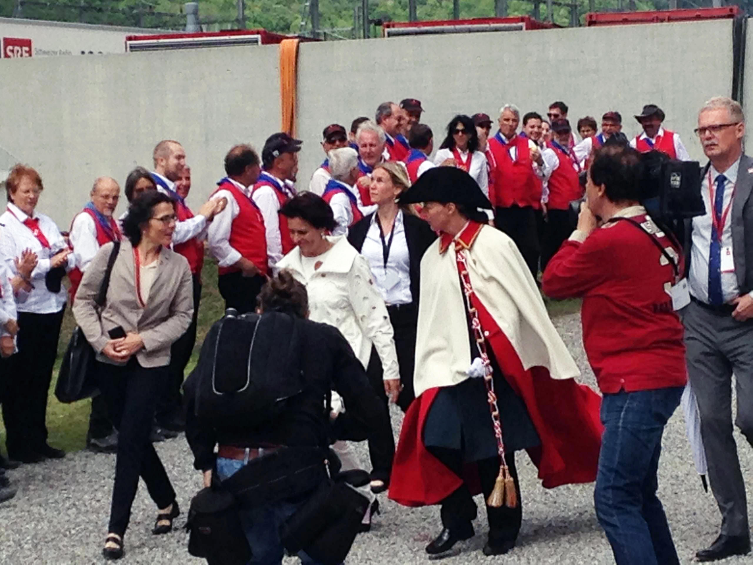 La ministre des Transports Doris Leuthard très entourée lors de son arrivée à Pollegio, à l’entrée sud du tunnel de base du Gothard.