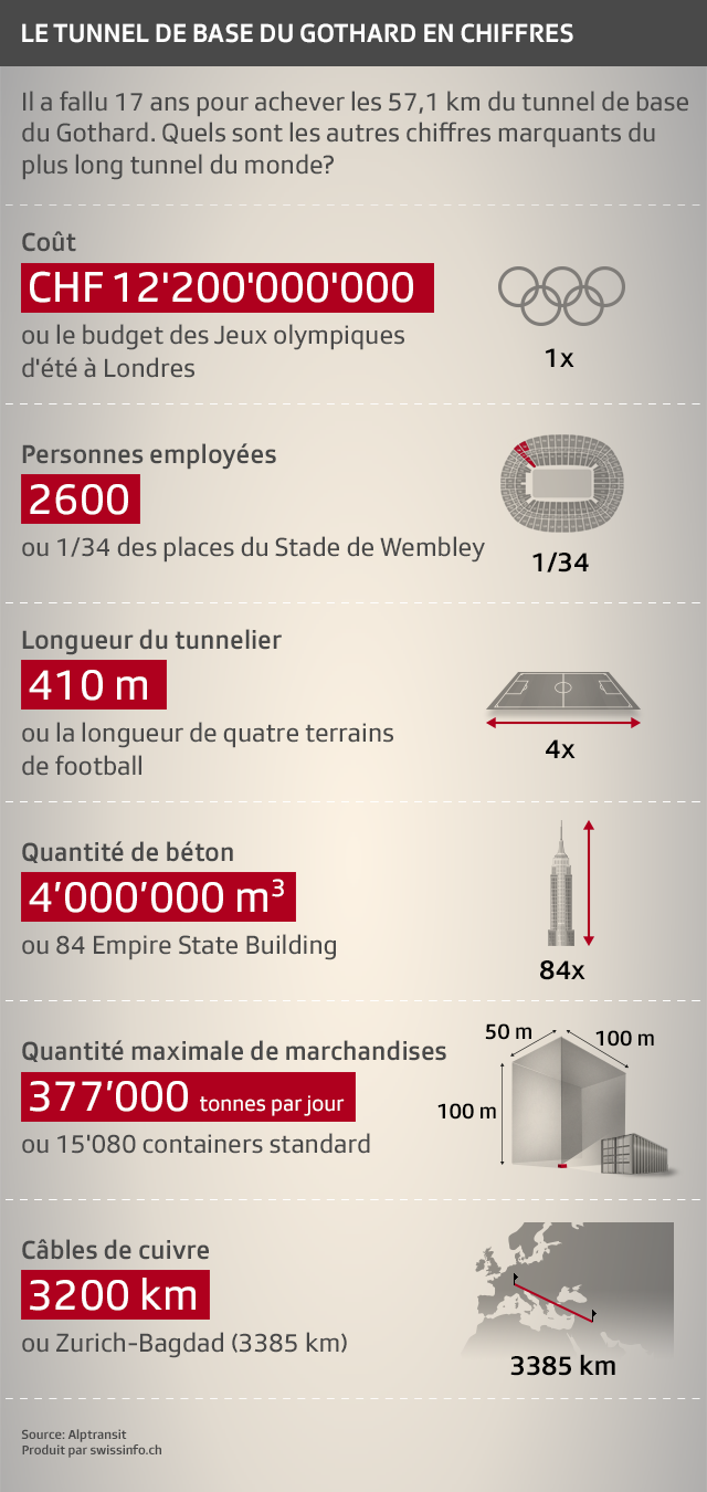 En ce qui concerne les marchandises – le tunnel a été construit en premier lieu pour faciliter le transfert de la route au rail – les CFF ont communiqué que les cargaisons sont d’environ 67’000 tonnes par jour, soit 120 trains quotidiens. Cette quantité équivaut au chargement de 5576 camions.